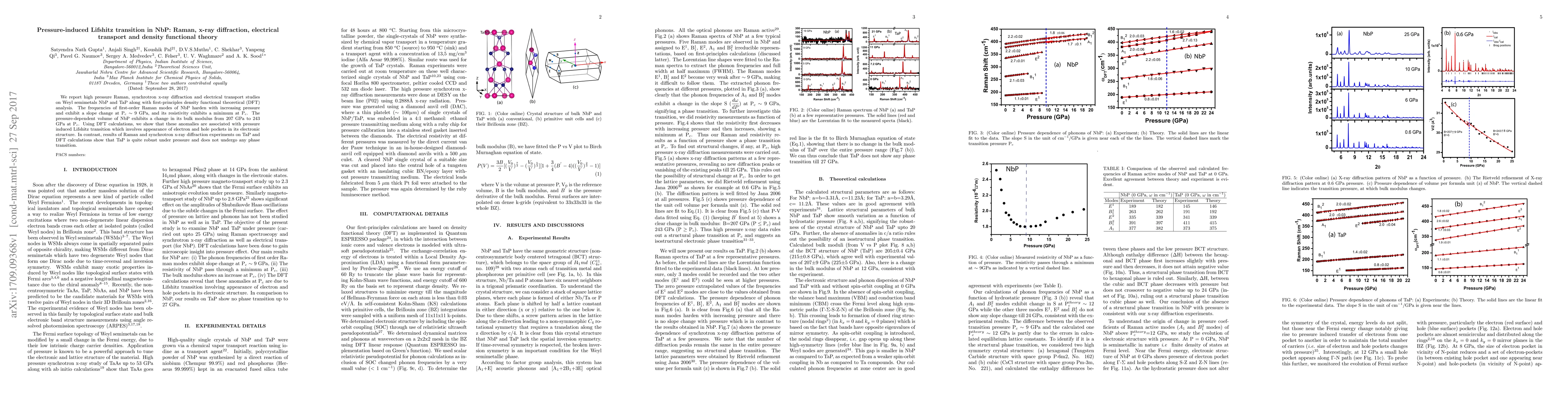 This study investigates the pressure-induced Lifshitz transition in NbP through Raman spectroscopy, x-ray diffraction, and electrical transport measurements, revealing a phase transition at 9 GPa associated with changes in electronic structure. In contrast, TaP remains stable under pressure without any phase transition.