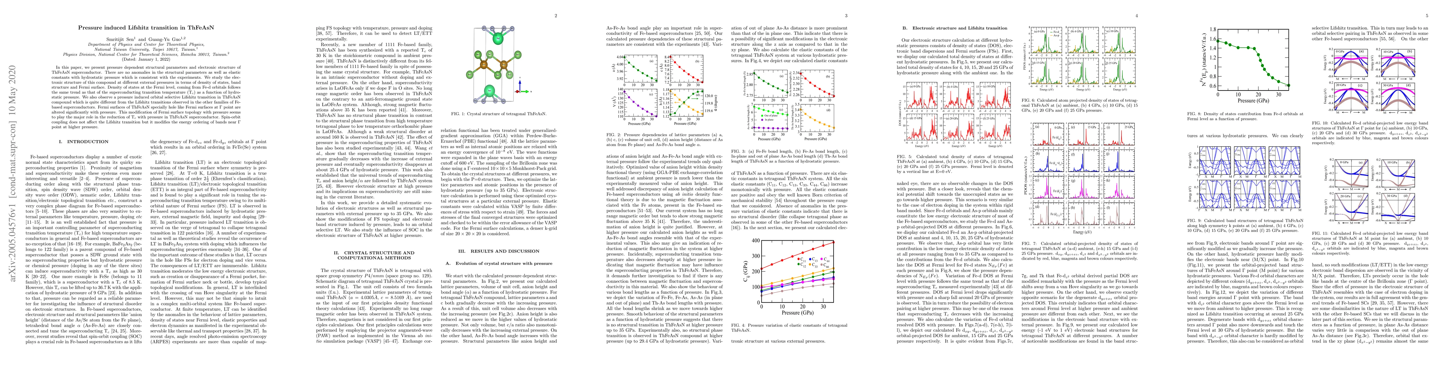 In this paper, we present pressure dependent structural parameters and electronic structure of ThFeAsN superconductor. There are no anomalies in the structural parameters as well as elastic constants with hydrostatic pressure which is consistent with the experiments. We study the electronic structure of this compound at different external pressures in terms of density of states, band structure and Fermi surface. Density of states at the Fermi level, coming from Fe-d orbitals follows the same trend as that of the superconducting transition temperature (T$_c$) as a function of hydrostatic pressure. We also observe a pressure induced orbital selective Lifshitz transition in ThFeAsN compound which is quite different from the Lifshitz transitions observed in the other families of Fe-based superconductors. Fermi surfaces of ThFeAsN specially hole like Fermi surfaces at $\Gamma$ point are altered significantly with pressure. This modification of Fermi surface topology with pressure seems to play the major role in the reduction of T$_c$ with pressure in ThFeAsN superconductor. Spin-orbit coupling does not affect the Lifshitz transition but it modifies the energy ordering of bands near $\Gamma$ point at higher pressure.