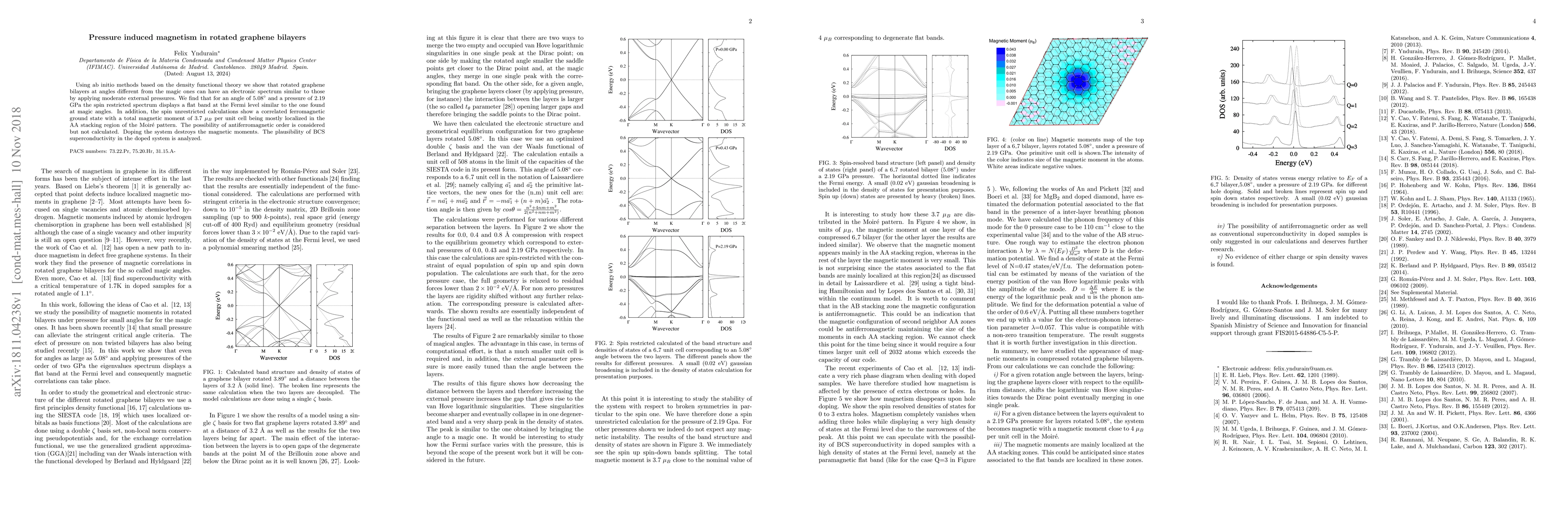 Using ab initio methods based on the density functional theory we show that rotated graphene bilayers at angles different from the magic ones can have an electronic spectrum similar to those by applying moderate external pressures. We find that for an angle of $5.08^{\circ}$ and a pressure of 2.19 GPa the spin restricted spectrum displays a flat band at the Fermi level similar to the one found at magic angles. In addition, the spin unrestricted calculations show a correlated ferromagnetic ground state with a total magnetic moment of 3.7 $\mu_{B}$ per unit cell being mostly localized in the AA stacking region of the Moir\'{e} pattern. The possibility of antiferromagnetic order is considered but not calculated. Doping the system destroys the magnetic moments. The plausibility of BCS superconductivity in the doped system is analyzed.