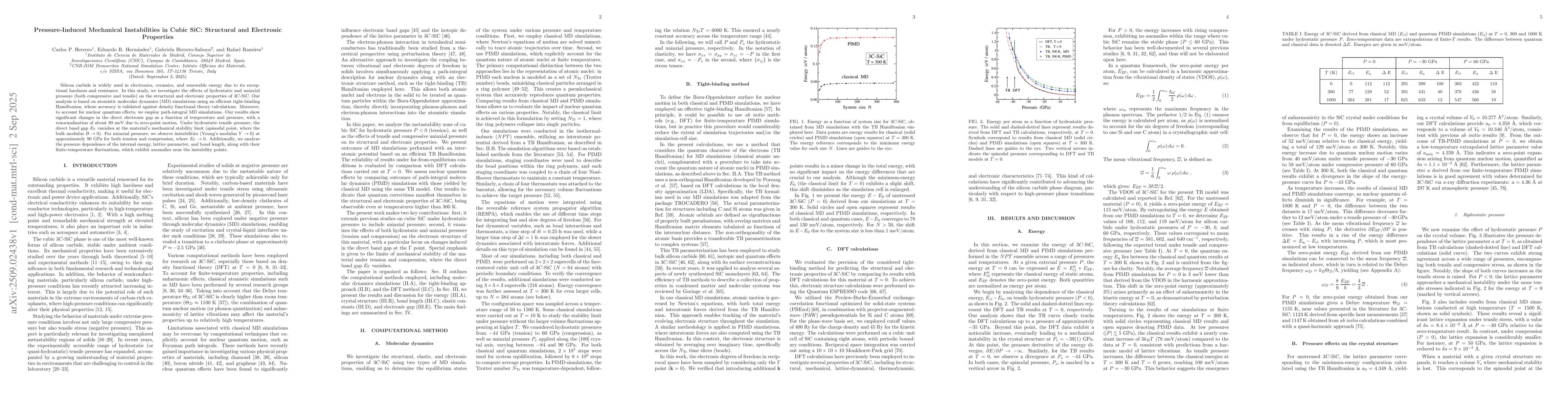Silicon carbide is widely used in electronics, ceramics, and renewable energy due to its exceptional hardness and resistance. In this study, we investigate the effects of hydrostatic and uniaxial pressure (both compressive and tensile) on the structural and electronic properties of $3C$-SiC. Our analysis is based on atomistic molecular dynamics (MD) simulations using an efficient tight-binding Hamiltonian, whose accuracy is validated against density functional theory calculations. Moreover, to account for nuclear quantum effects, we employ path-integral MD simulations. Our results show significant changes in the direct electronic gap as a function of temperature and pressure, with a renormalization of about 80 meV due to zero-point motion. Under hydrostatic tensile pressure, the direct band gap $E_{\Gamma}$ vanishes at the material's mechanical stability limit (spinodal point, where the bulk modulus $B \to 0$). For uniaxial pressure, we observe instabilities (Young's modulus $Y \to 0$) at approximately 90 GPa for both tension and compression, where $E_{\Gamma} \to 0$. Additionally, we analyze the pressure dependence of the internal energy, lattice parameter, and bond length, along with their finite-temperature fluctuations, which exhibit anomalies near the instability points.