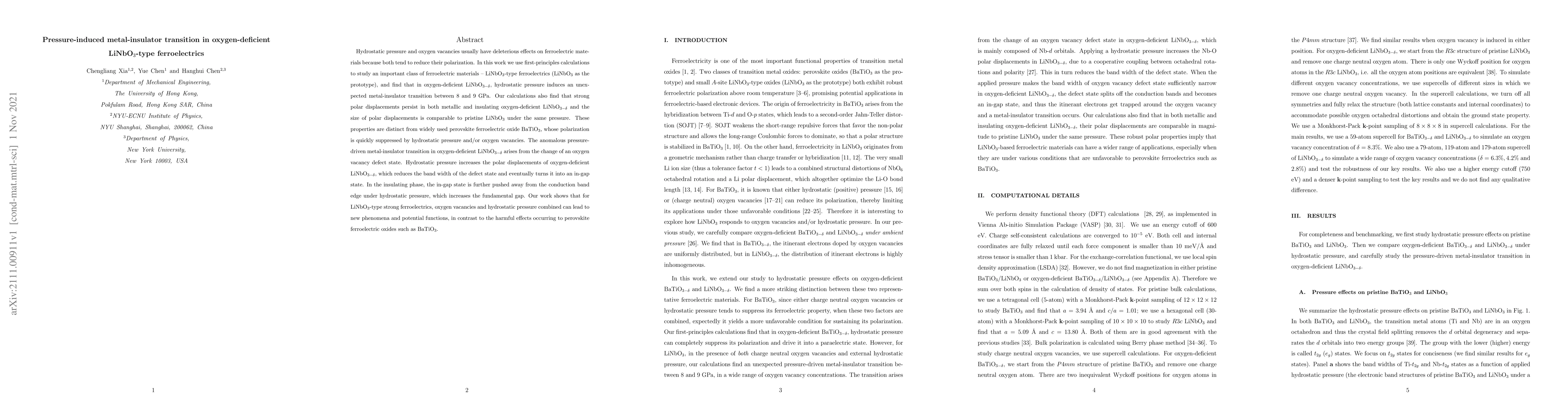Hydrostatic pressure and oxygen vacancies usually have deleterious effects on ferroelectric materials because both tend to reduce their polarization. In this work we use first-principles calculations to study an important class of ferroelectric materials - LiNbO$_3$-type ferroelectrics (LiNbO$_3$ as the prototype), and find that in oxygen-deficient LiNbO$_{3-\delta}$, hydrostatic pressure induces an unexpected metal-insulator transition between 8 and 9 GPa. Our calculations also find that strong polar displacements persist in both metallic and insulating oxygen-deficient LiNbO$_{3-\delta}$ and the size of polar displacements is comparable to pristine LiNbO$_3$ under the same pressure. These properties are distinct from widely used perovskite ferroelectric oxide BaTiO$_3$, whose polarization is quickly suppressed by hydrostatic pressure and/or oxygen vacancies. The anomalous pressure-driven metal-insulator transition in oxygen-deficient LiNbO$_{3-\delta}$ arises from the change of an oxygen vacancy defect state. Hydrostatic pressure increases the polar displacements of oxygen-deficient LiNbO$_{3-\delta}$, which reduces the band width of the defect state and eventually turns it into an in-gap state. In the insulating phase, the in-gap state is further pushed away from the conduction band edge under hydrostatic pressure, which increases the fundamental gap. Our work shows that for LiNbO$_3$-type strong ferroelectrics, oxygen vacancies and hydrostatic pressure combined can lead to new phenomena and potential functions, in contrast to the harmful effects occurring to perovskite ferroelectric oxides such as BaTiO$_3$.