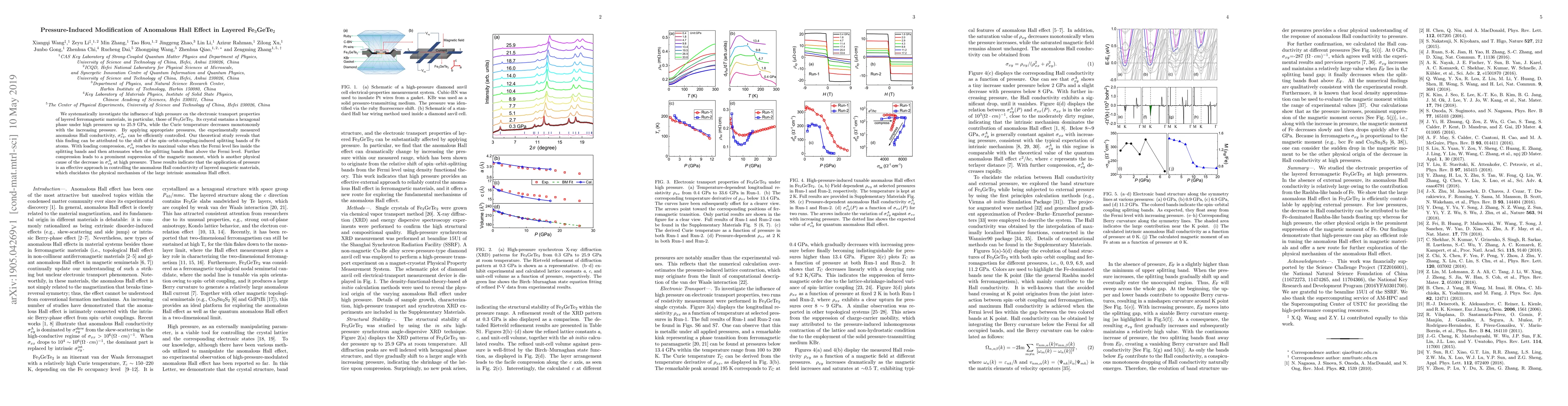 We systematically investigate the influence of high pressure on the electronic transport properties of layered ferromagnetic materials, in particular, those of Fe$_3$GeTe$_2$. Its crystal sustains a hexagonal phase under high pressures up to 25.9 GPa, while the Curie temperature decreases monotonously with the increasing pressure. By applying appropriate pressures, the experimentally measured anomalous Hall conductivity, $\sigma_{xy}^A$, can be efficiently controlled. Our theoretical study reveals that this finding can be attributed to the shift of the spin--orbit-coupling-induced splitting bands of Fe atoms. With loading compression, $\sigma_{xy}^A$ reaches its maximal value when the Fermi level lies inside the splitting bands and then attenuates when the splitting bands float above the Fermi level. Further compression leads to a prominent suppression of the magnetic moment, which is another physical cause of the decrease in $\sigma_{xy}^A$ at high pressure. These results indicate that the application of pressure is an effective approach in controlling the anomalous Hall conductivity of layered magnetic materials, which elucidates the physical mechanism of the large intrinsic anomalous Hall effect.