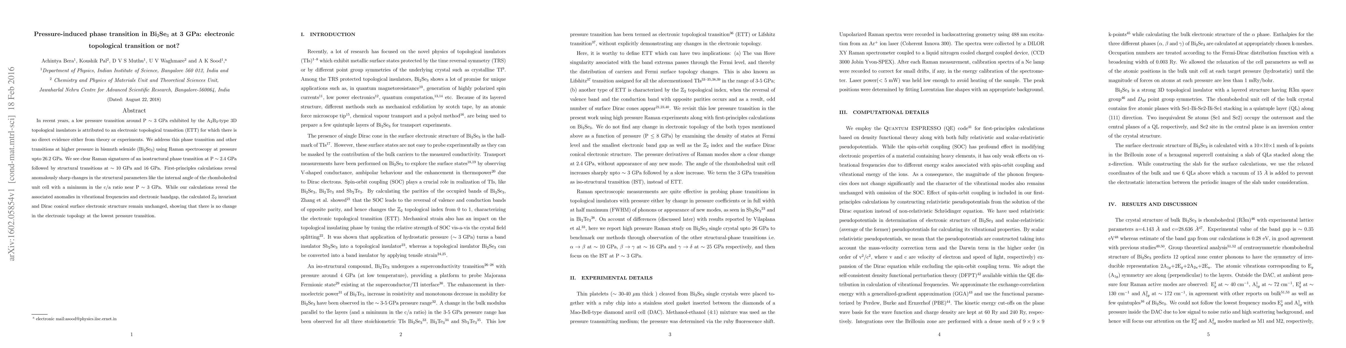 In recent years, a low pressure transition around P $\sim$ 3 GPa exhibited by the A$_2$B$_3$-type 3D topological insulators is attributed to an electronic topological transition (ETT) for which there is no direct evidence either from theory or experiments. We address this phase transition and other transitions at higher pressure in bismuth selenide (Bi$_2$Se$_3$) using Raman spectroscopy at pressure upto 26.2 GPa. We see clear Raman signatures of an isostructural phase transition at P $\sim$ 2.4 GPa followed by structural transitions at $\sim$ 10 GPa and 16 GPa. First-principles calculations reveal anomalously sharp changes in the structural parameters like the internal angle of the rhombohedral unit cell with a minimum in the c/a ratio near P $\sim$ 3 GPa. While our calculations reveal the associated anomalies in vibrational frequencies and electronic bandgap, the calculated $\mathbb{Z}_2$ invariant and Dirac conical surface electronic structure remain unchanged, showing that there is no change in the electronic topology at the lowest pressure transition.