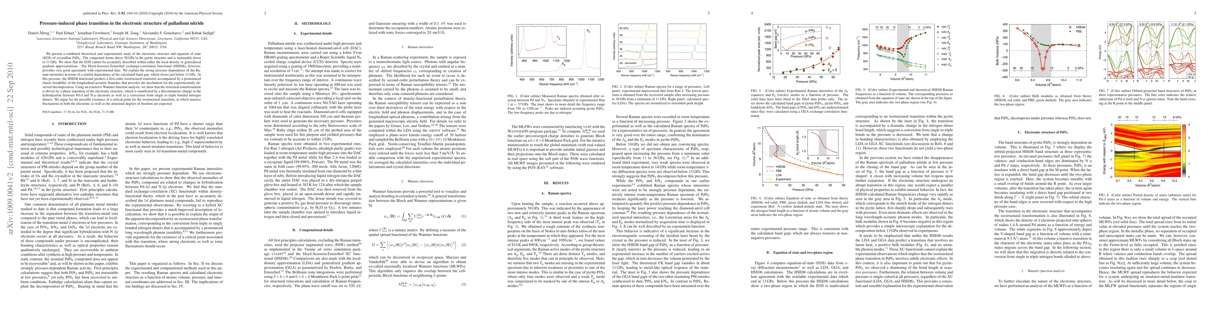This study combines theoretical and experimental methods to investigate the pressure-induced phase transition in palladium nitride (PdN2), revealing a first-order isostructural transition at around 11 GPa driven by changes in electronic structure and bonding between Pd and N atoms. The Heyd-Scuseria-Ernzerhof functional accurately predicts the transition and associated elastic instability.