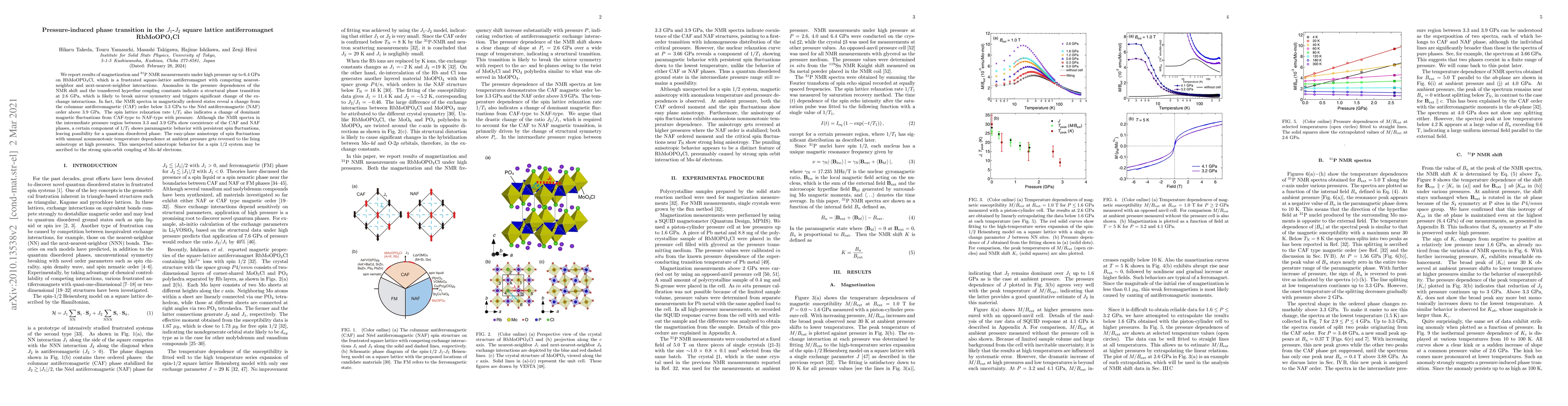 We report results of magnetization and $^{31}$P NMR measurements under high pressure up to 6.4~GPa on RbMoOPO$_4$Cl, which is a frustrated square-lattice antiferromagnet with competing nearest-neighbor and next-nearest-neighbor interactions. Anomalies in the pressure dependences of the NMR shift and the transferred hyperfine coupling constants indicate a structural phase transition at 2.6~GPa, which is likely to break mirror symmetry and triggers significant change of the exchange interactions. In fact, the NMR spectra in magnetically ordered states reveal a change from the columnar antiferromagnetic (CAF) order below 3.3~GPa to the N\'{e}el antiferromagnetic (NAF) order above 3.9~GPa. The spin lattice relaxation rate $1/T_1$ also indicates a change of dominant magnetic fluctuations from CAF-type to NAF-type with pressure. Although the NMR spectra in the intermediate pressure region between 3.3 and 3.9 GPa show coexistence of the CAF and NAF phases, a certain component of $1/T_1$ shows paramagnetic behavior with persistent spin fluctuations, leaving possibility for a quantum disordered phase. The easy-plane anisotropy of spin fluctuations with unusual nonmonotonic temperature dependence at ambient pressure gets reversed to the Ising anisotropy at high pressures. This unexpected anisotropic behavior for a spin 1/2 system may be ascribed to the strong spin-orbit coupling of Mo-4$d$ electrons.