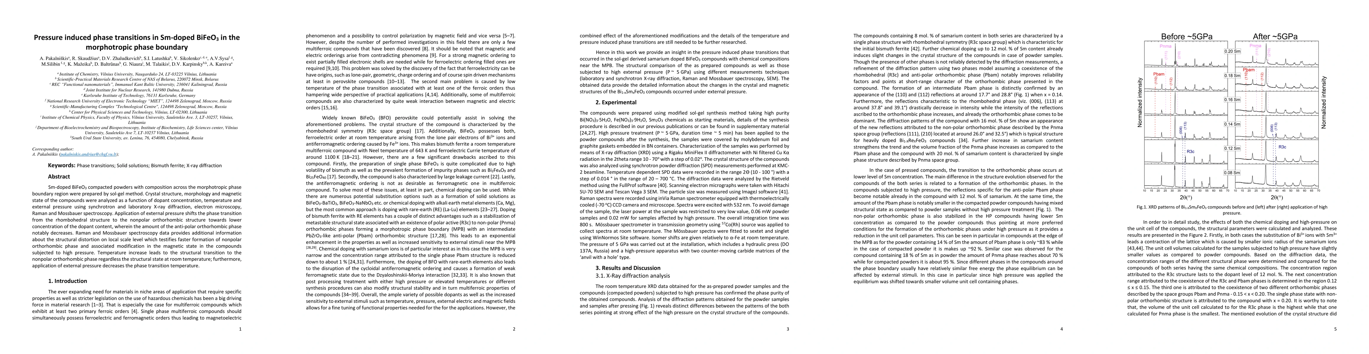Sm-doped BiFeO3 compacted powders with composition across the morphotropic phase boundary region were prepared by sol-gel method. Crystal structure, morphology and magnetic state of the compounds were analyzed as a function of dopant concentration, temperature and external pressure using synchrotron and laboratory X-ray diffraction, electron microscopy, Raman and Mossbauer spectroscopy. Application of external pressure shifts the phase transition from the rhombohedral structure to the nonpolar orthorhombic structure towards lower concentration of the dopant content, wherein the amount of the anti-polar orthorhombic phase notably decreases. Raman and Mossbauer spectroscopy data provides additional information about the structural distortion on local scale level which testifies faster formation of nonpolar orthorhombic phase and associated modification in the magnetic state in the compounds subjected to high pressure. Temperature increase leads to the structural transition to the nonpolar orthorhombic phase regardless the structural state at room temperature; furthermore, application of external pressure decreases the phase transition temperature.