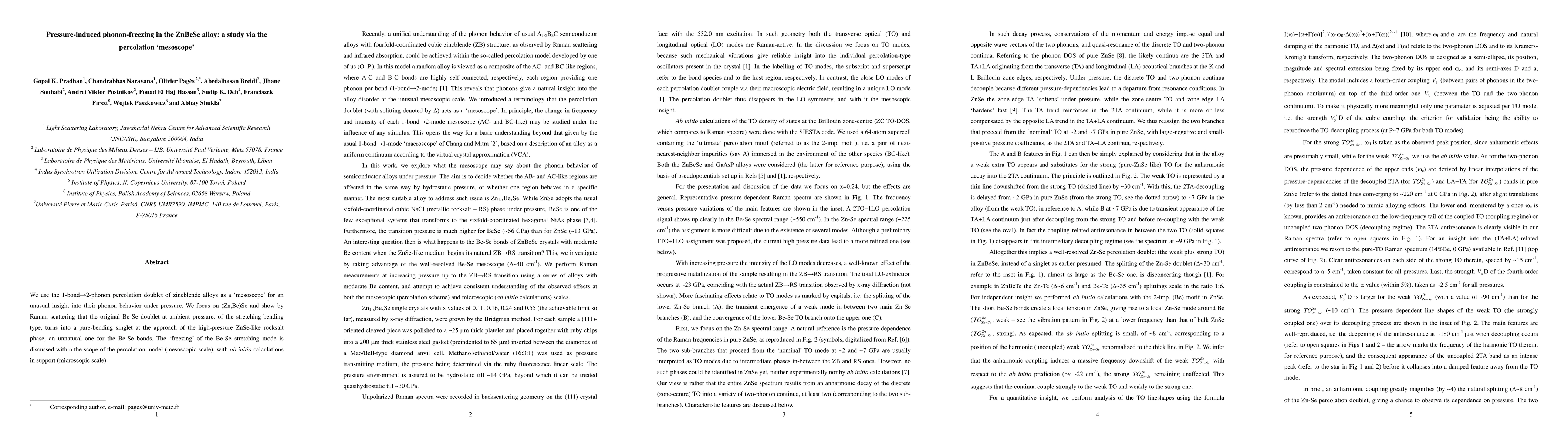 We use the 1-bond -> 2-phonon percolation doublet of zincblende alloys as a mesoscope for an unusual insight into their phonon behavior under pressure. We focus on (Zn,Be)Se and show by Raman scattering that the original Be-Se doublet at ambient pressure, of the stretching-bending type, turns into a pure-bending singlet at the approach of the high-pressure ZnSe-like rocksalt phase, an unnatural one for the Be-Se bonds. The freezing of the Be-Se stretching mode is discussed within the scope of the percolation model (mesoscopic scale), with ab initio calculations in support (microscopic scale).