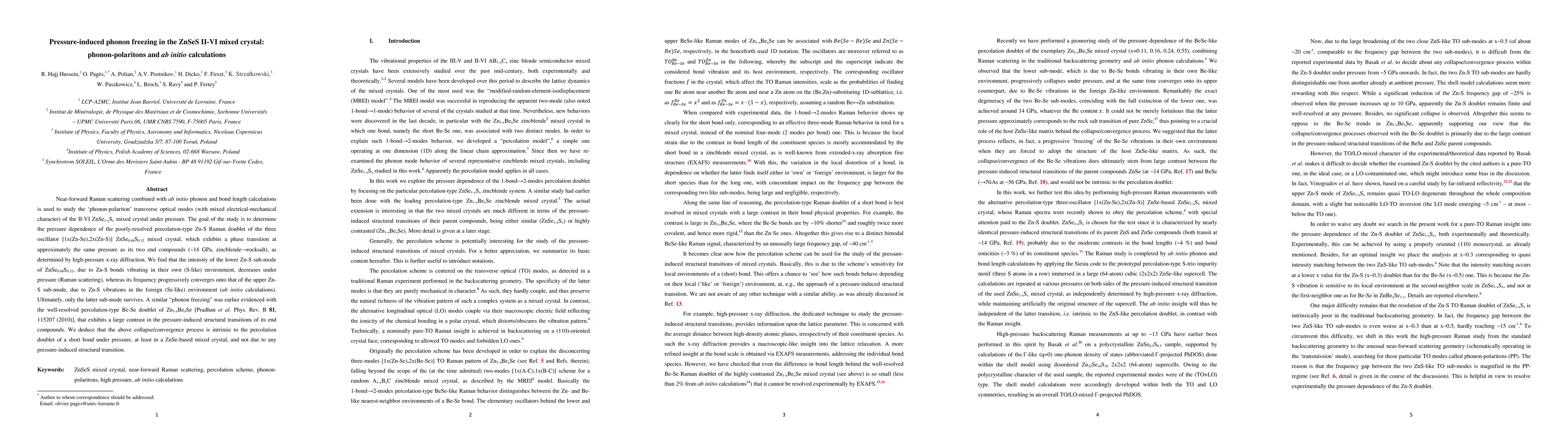 Near-forward Raman scattering combined with ab initio phonon and bond length calculations is used to study the phonon-polariton transverse optical modes (with mixed electrical and mechanical character) of the II-VI ZnSeS mixed crystal under pressure. The goal of the study is to determine the pressure dependence of the poorly resolved percolation-type Zn-S Raman doublet of the three oscillator [1(Zn-Se),2(Zn-S)] ZnSe68S32 mixed crystal, which exhibits a phase transition at approximately the same pressure as its two end compounds (~14 GPa, zincblende-to-rocksalt), as determined by high-pressure x-ray diffraction. We find that the intensity of the lower Zn-S sub-mode of ZnSe68S32, due to Zn-S bonds vibrating in their own (S-like) environment, decreases under pressure (Raman scattering), whereas its frequency progressively converges onto that of the upper Zn- S sub-mode, due to Zn-S vibrations in the foreign (Se-like) environment (ab initio calculations). Ultimately, only the latter sub-mode survives. A similar phonon freezing was earlier evidenced with the well-resolved percolation-type Be-Se doublet of ZnBeSe [Pradhan et al. Phys. Rev. B 81, 115207 (2010)], that exhibits a large contrast in the pressure-induced structural transitions of its end compounds. We deduce that the above collapse and convergence process is intrinsic to the percolation doublet of a short bond under pressure, at least in a ZnSe-based mixed crystal, and not due to any pressure-induced structural transition.