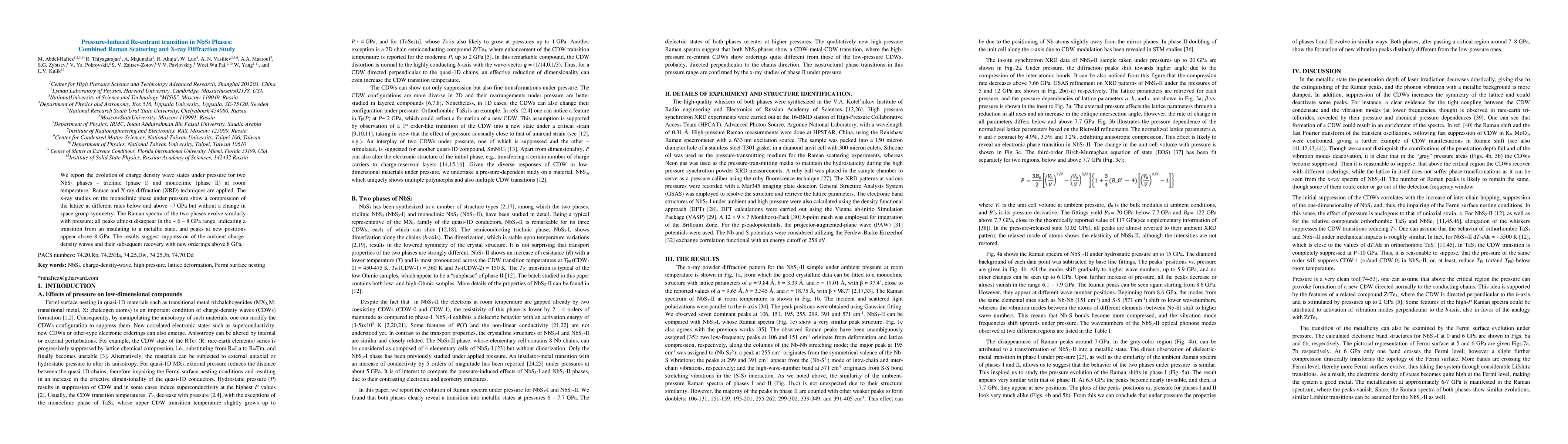 This study investigates the pressure-induced phase transitions in NbS3 phases using Raman scattering and X-ray diffraction. Both triclinic and monoclinic phases show a transition from insulating to metallic states around 6-8 GPa, with the monoclinic phase experiencing lattice compression without changing its space group.