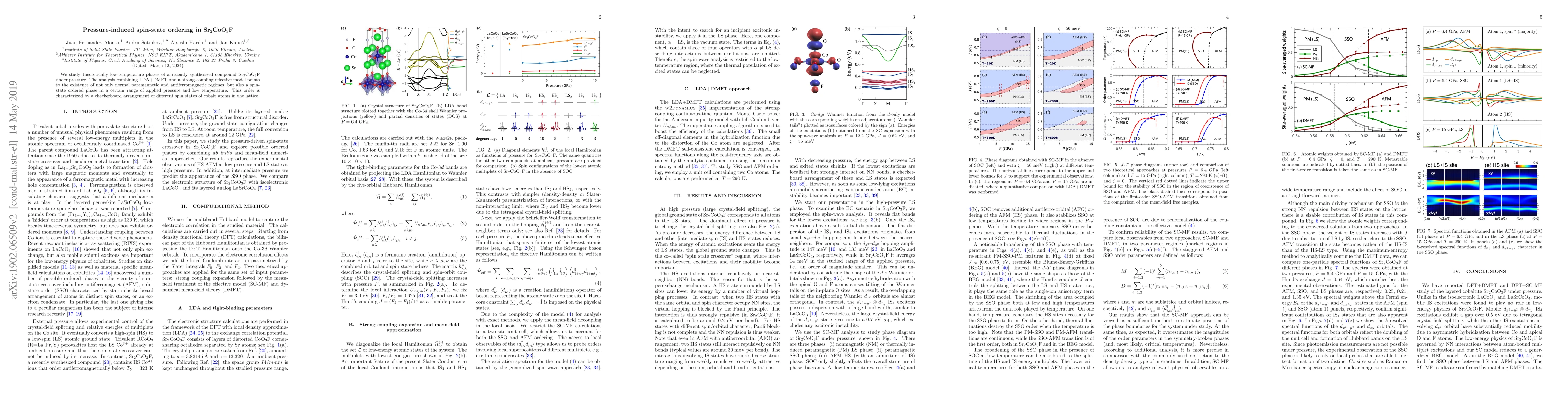 We study theoretically low-temperature phases of a recently synthesized compound Sr$_2$CoO$_3$F under pressure. The analysis combining LDA+DMFT and a strong-coupling effective model points to the existence of not only normal paramagnetic and antiferromagnetic regimes, but also a spin-state ordered phase in a certain range of applied pressure and low temperature. This order is characterized by a checkerboard arrangement of different spin states of cobalt atoms in the lattice.