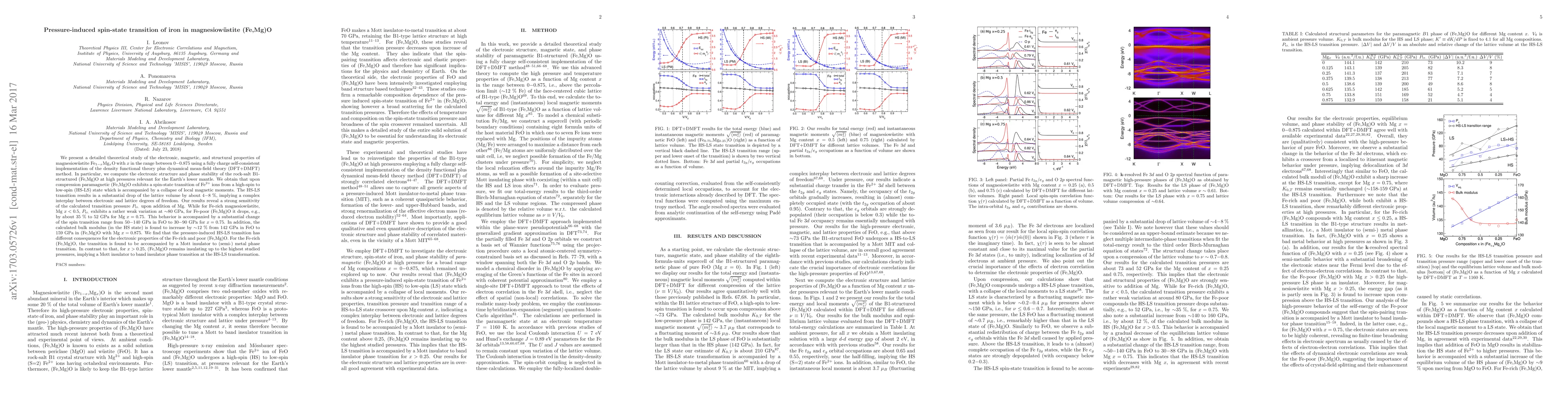 This study investigates the pressure-induced spin-state transition of iron in magnesiowustite (Fe,Mg)O using DFT+DMFT, revealing a high-spin to low-spin transition in Fe$^{2+}$ ions under high pressure, leading to a significant lattice volume reduction and varying transition pressures depending on Mg content.