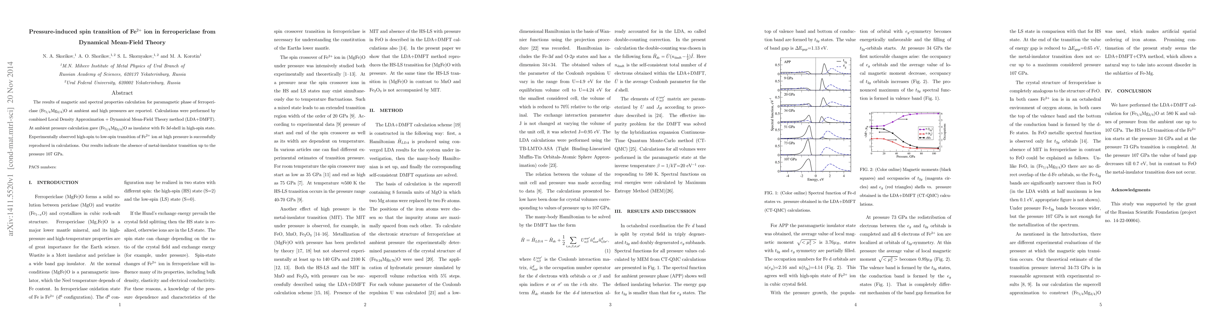 The results of magnetic and spectral properties calculation for paramagnetic phase of ferropericlase (Fe$_{1/4}$Mg$_{3/4}$)O at ambient and high pressures are reported. Calculations were performed by combined Local Density Approximation + Dynamical Mean-Field Theory method (LDA+DMFT). At ambient pressure calculation gave (Fe$_{1/4}$Mg$_{3/4}$)O as insulator with Fe 3$d$-shell in high-spin state. Experimentally observed high-spin to low-spin transition of Fe$^{2+}$ ion at high pressure is successfully reproduced in calculations. Our results indicate the absence of metal-insulator transition up to the pressure 107~GPa.