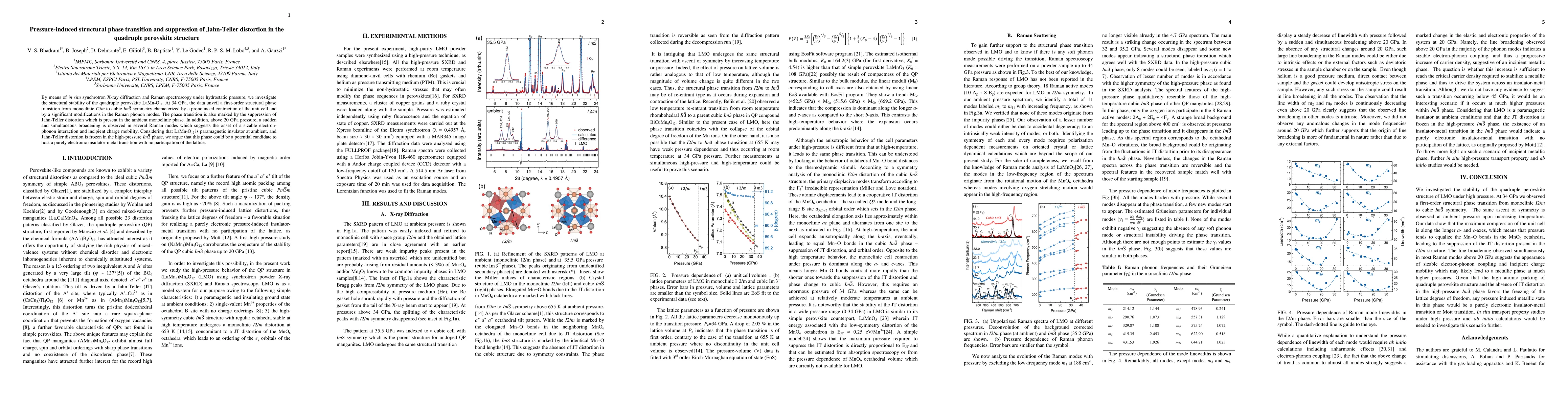 By means of in situ synchrotron X-ray diffraction and Raman spectroscopy under hydrostatic pressure, we investigate the structural stability of the quadruple perovskite LaMn7O12. At 34 GPa, the data unveil a first-order structural phase transition from monoclinic I2/m to cubic Im-3 symmetry characterized by a pronounced contraction of the unit cell and by a significant modifications in the Raman phonon modes. The phase transition is also marked by the suppression of Jahn-Teller distortion which is present in the ambient monoclinic phase. In addition, above 20 GPa pressure, a sudden and simultaneous broadening is observed in several Raman modes which suggests the onset of a sizable electron-phonon interaction and incipient charge mobility. Considering that LaMn7O12 is paramagnetic insulator at ambient, and Jahn-Teller distortion is frozen in the high-pressure Im-3 phase, we argue that this phase could be a potential candidate to host a purely electronic insulator-metal transition with no participation of the lattice
