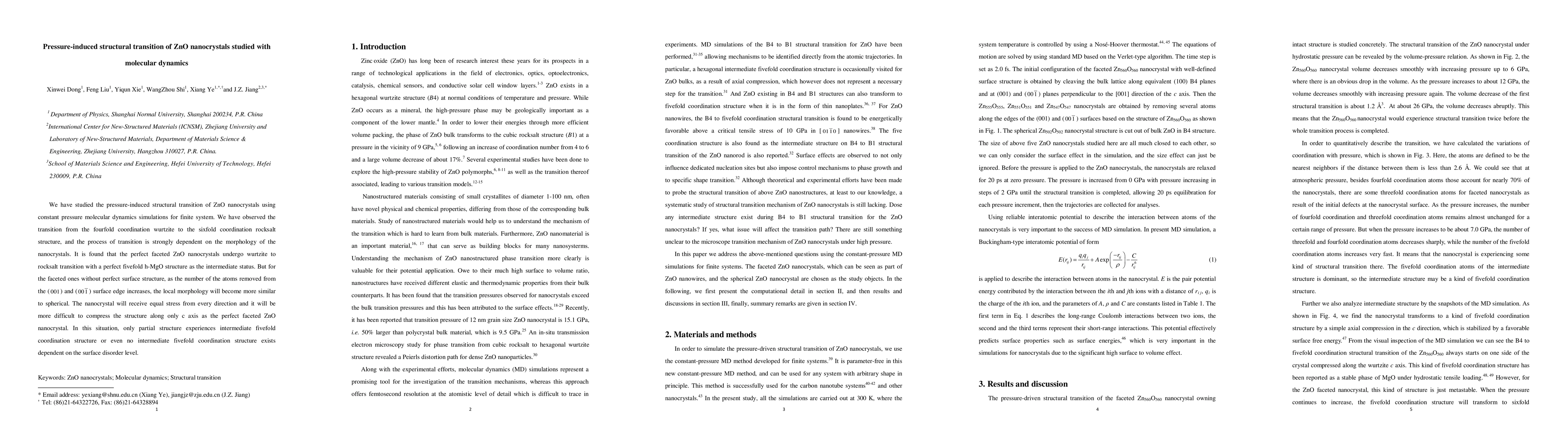 This study uses molecular dynamics simulations to investigate the pressure-induced structural transition in ZnO nanocrystals, revealing a shift from wurtzite to rocksalt coordination, with the transition process heavily influenced by the nanocrystal's morphology. Perfect faceted nanocrystals transition through a fivefold h-MgO intermediate, while disordered nanocrystals show a more spherical morphology and a less defined transition process.