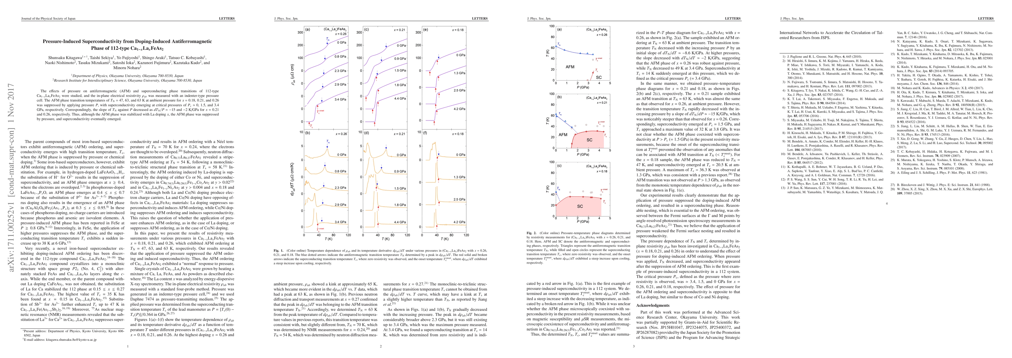 The effects of pressure on antiferromagnetic (AFM) and superconducting phase transitions of 112-type Ca$_{1-x}$La$_{x}$FeAs$_{2}$ were studied, and the in-plane electrical resistivity $\rho_{ab}$ was measured with an indenter-type pressure cell. The AFM phase transition temperatures of $T_{\rm N}$ = 47, 63, and 63 K at ambient pressure for $x$ = 0.18, 0.21, and 0.26 was suppressed by applying pressure $P$, with superconductivity emerging at critical pressures of $P_{\rm c}$ $\simeq$ 0, 1.5, and 3.4 GPa, respectively. Correspondingly, the slope of $T_{\rm N}$ against $P$ decreased as $dT_{\rm N}/P$ $\simeq$ $-$15 and $-$2 K/GPa for $x$ = 0.21 and 0.26, respectively. Thus, although the AFM phase was stabilized with La doping $x$, the AFM phase was suppressed by pressure, and superconductivity eventually emerged.