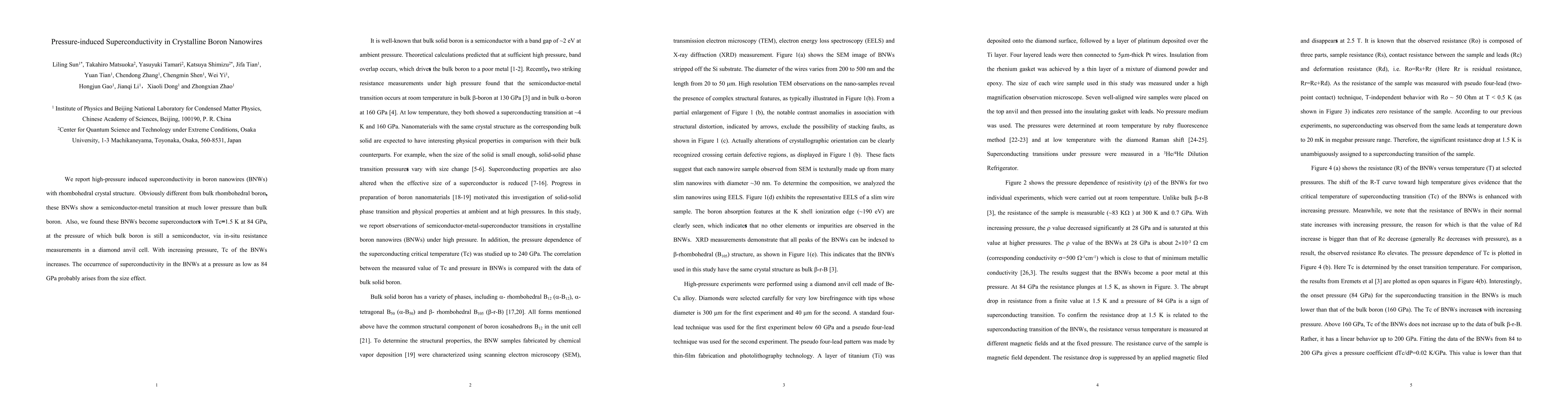 This study reveals that boron nanowires with rhombohedral structure exhibit superconductivity at 1.5 K under 84 GPa pressure, contrasting with bulk rhombohedral boron which remains a semiconductor at similar pressures. The observed superconductivity likely results from the unique size effects in the nanowires.