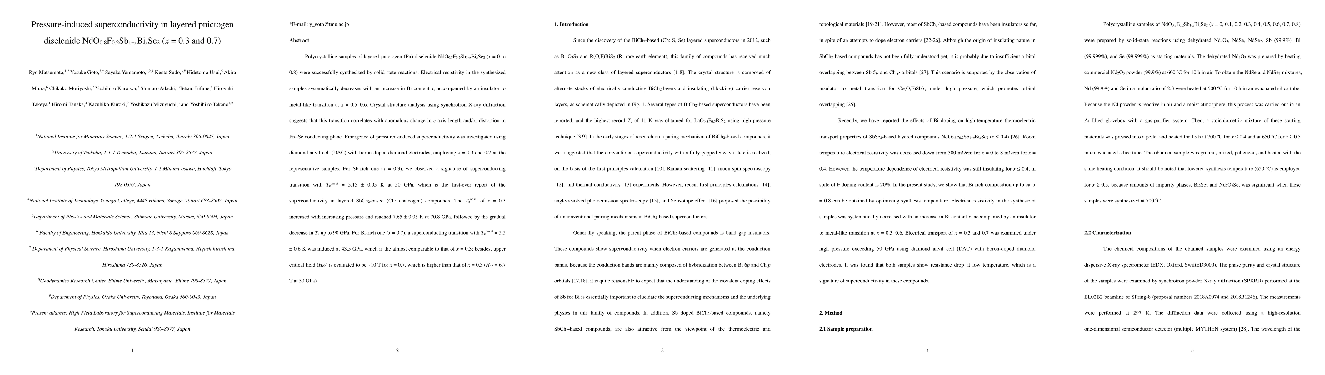 Polycrystalline samples of layered pnictogen diselenide NdO0.8F0.2Sb1-xBixSe2 (x = 0 to 0.8) were successfully synthesized by solid-state reactions. Electrical resistivity in the synthesized samples was systematically decreased with an increase in Bi content x. Crystal structure analysis using synchrotron X-ray diffraction suggests that insulator to metal transition upon Bi doping correlates with anomalous change in c-axis length and/or corrugation in conducting layer. The emergence of superconductivity under high pressure is demonstrated using diamond anvil cell (DAC) with boron-doped diamond electrodes, for x = 0.3 and 0.7 as the representative samples. For Sb-rich one (x = 0.3), we observed a superconducting transition with Tconset = 5.3 K at 50 GPa, which is the first-ever report of the superconductivity in layered SbCh2-based (Ch: chalcogen) compounds. The Tconset of x = 0.3 increased with increasing pressure and reached 7.9 K at 70.8 GPa, followed by the gradual decrease in Tc up to 90 GPa. For Bi-rich one (x = 0.7), a superconducting transition with Tconset = 5.9 K was observed at 43.5 GPa, which is the almost comparable to that of x = 0.3; besides, upper critical field (Hc2) is evaluated to be ~10 T for x = 0.7, which is higher than that of x = 0.3 (Hc2 = 6.7 T at 50 GPa).