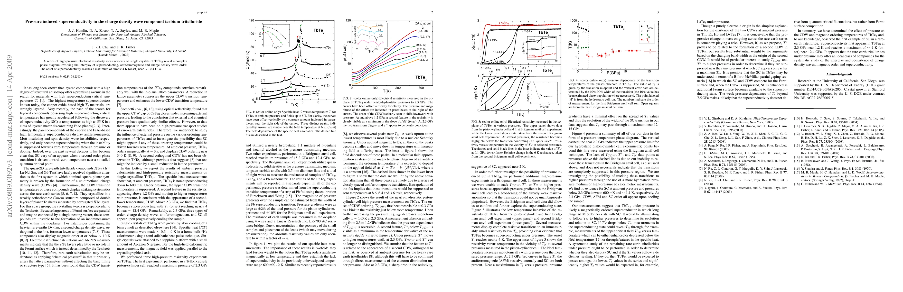 Summary: High-pressure resistivity measurements on TbTe3 single crystals reveal superconductivity up to ~3.5 K at 75 kbar, alongside antiferromagnetic and charge density wave phases, indicating a complex interplay of these orders.