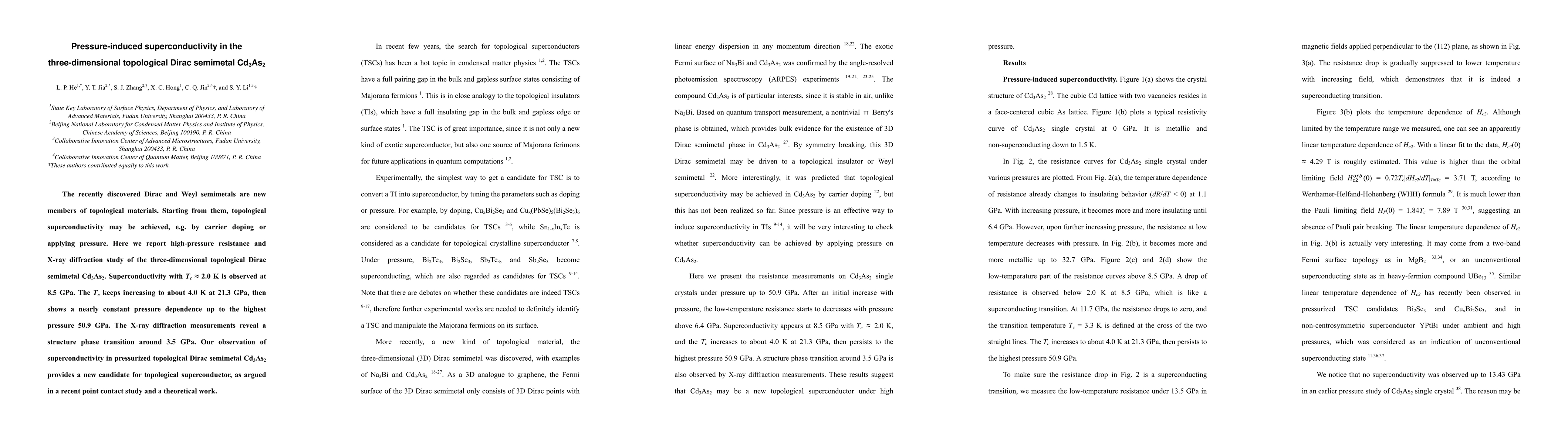 High-pressure study on Cd3As2 reveals superconductivity onset at 8.5 GPa with Tc ~ 2.0 K, increasing to 4.0 K at 21.3 GPa, and remains stable up to 50.9 GPa, indicating potential for topological superconductivity.