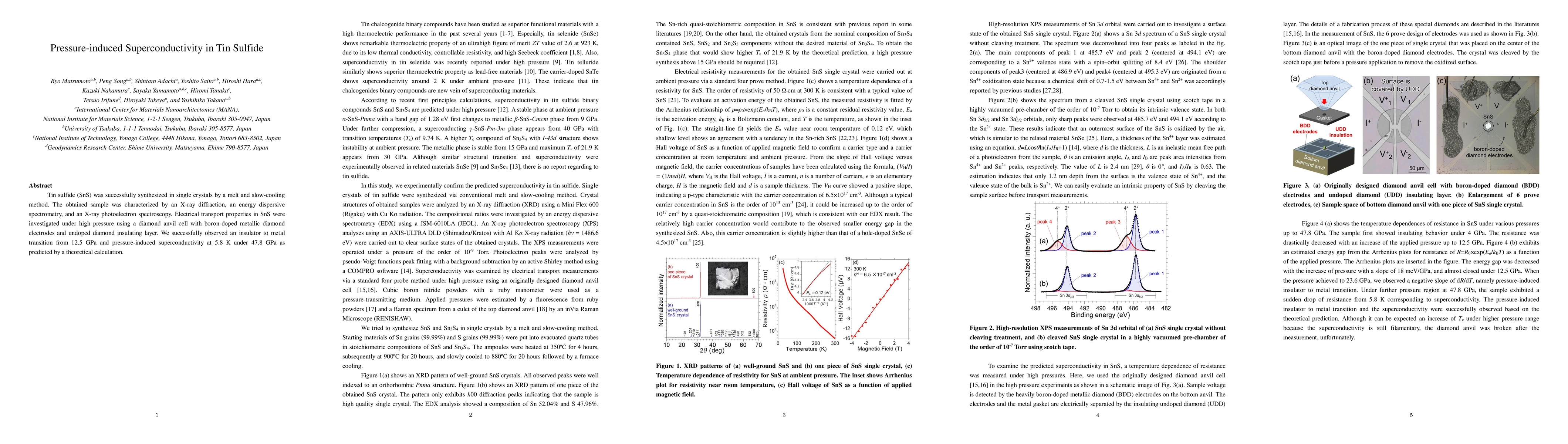 Researchers synthesized single crystals of tin sulfide (SnS) and observed an insulator-to-metal transition at 12.5 GPa and pressure-induced superconductivity at 5.8 K under 47.8 GPa, confirming theoretical predictions.