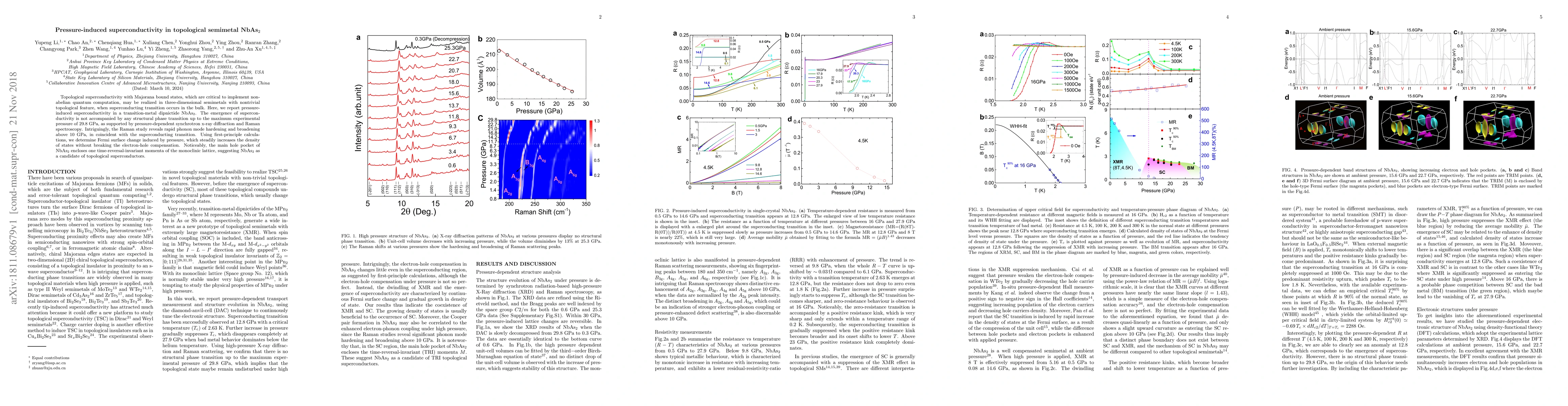 This study reports pressure-induced superconductivity in NbAs2, a transition-metal dipnictide, without structural phase transitions, potentially indicating it as a topological superconductor. Raman spectroscopy shows phonon hardening coinciding with superconductivity, while first-principles calculations reveal Fermi surface changes enhancing the density of states without disrupting electron-hole balance.