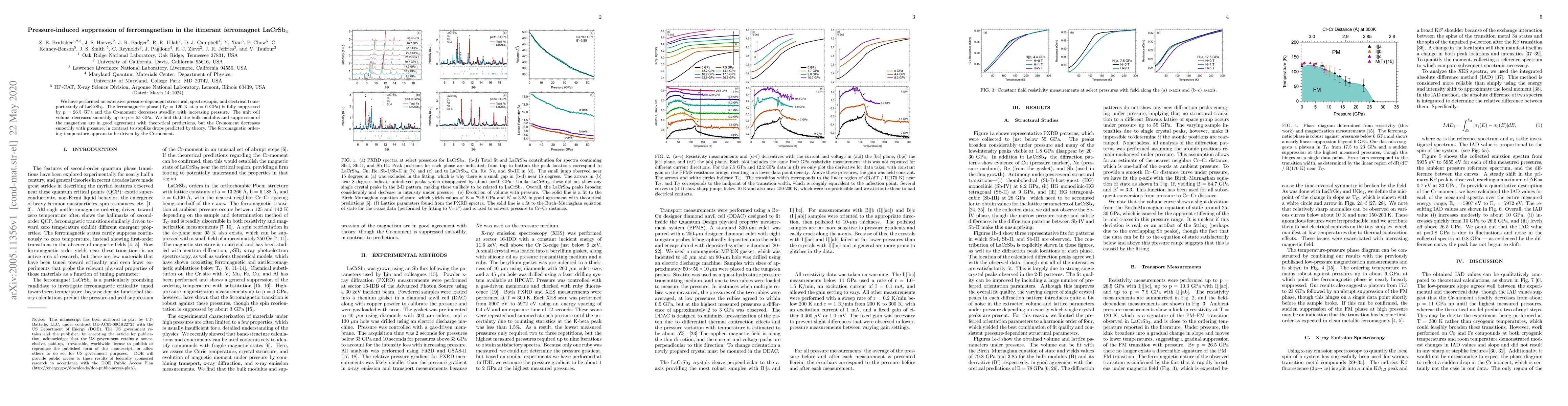 The study on LaCrSb$_3$ shows that its ferromagnetic phase, initially at 120K under no pressure, is completely suppressed at 26.5 GPa. Despite theoretical predictions, the crystal moment decreases gradually with pressure, not in steplike fashion, aligning with bulk modulus changes as theorized.