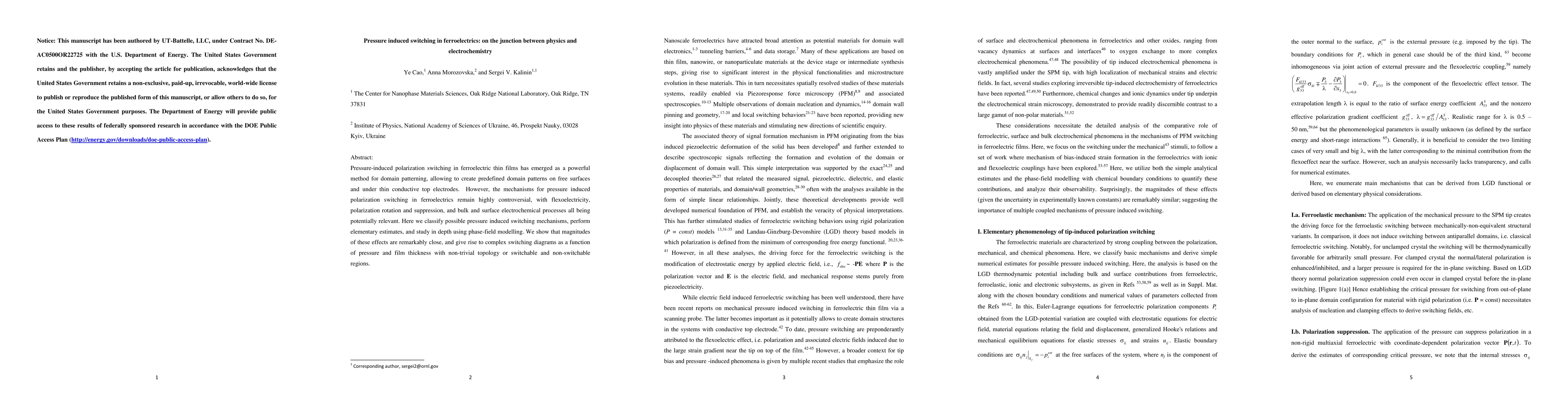This paper investigates the mechanisms behind pressure-induced polarization switching in ferroelectric thin films, exploring flexoelectricity, polarization rotation, suppression, and electrochemical processes. Through phase-field modeling, the authors show that these effects are closely related and lead to complex switching patterns dependent on pressure and film thickness.
