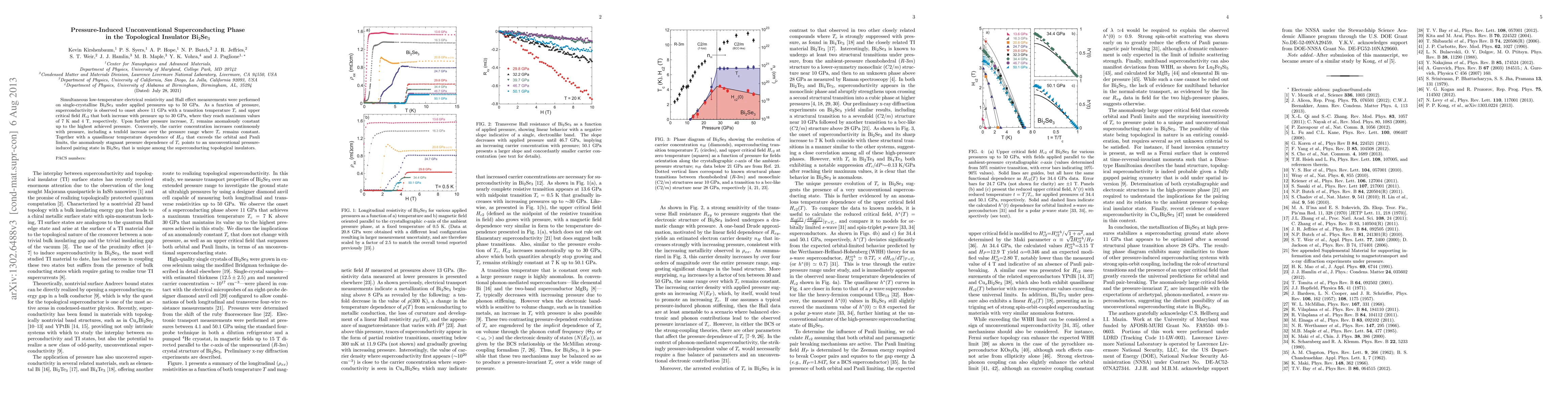 This study reveals that Bi2Se3, a topological insulator, exhibits an unconventional superconducting phase under high pressure, with superconductivity onset above 11 GPa and a maximum transition temperature of 7 K at 30 GPa. The superconducting transition temperature remains constant despite a significant increase in carrier concentration, indicating a unique pairing mechanism.