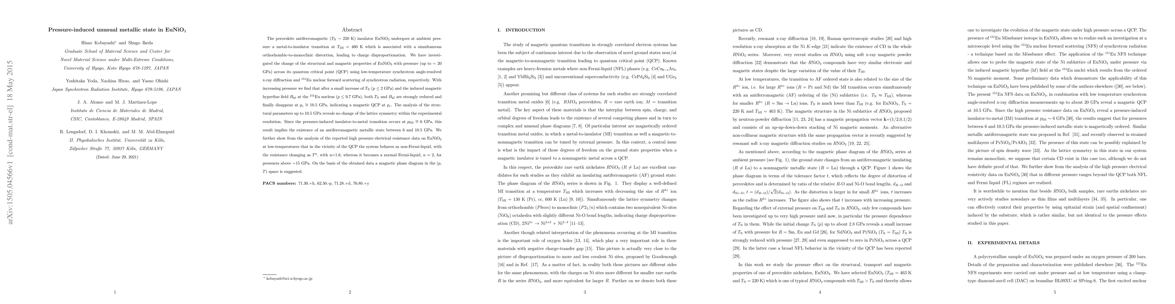 The perovskite antiferromagnetic ($T_{\rm N}$ $\sim$ 220 K) insulator EuNiO$_3$ undergoes at ambient pressure a metal-to-insulator transition at $T_{\rm MI}$ = 460 K which is associated with a simultaneous orthorhombic-to-monoclinic distortion, leading to charge disproportionation. We have investigated the change of the structural and magnetic properties of EuNiO$_3$ with pressure (up to $\sim$ 20 GPa) across its quantum critical point (QCP) using low-temperature synchrotron angle-resolved x-ray diffraction and $^{151}$Eu nuclear forward scattering of synchrotron radiation, respectively. With increasing pressure we find that after a small increase of $T_{\rm N}$ ($p$ $\leq$ 2 GPa) and the induced magnetic hyperfine field $B_{\rm hf}$ at the $^{151}$Eu nucleus ($p$ $\leq$ 9.7 GPa), both $T_{\rm N}$ and $B_{\rm hf}$ are strongly reduced and finally disappear at $p_{\rm c}$ $\cong$ 10.5 GPa, indicating a magnetic QCP at $p_{\rm c}$. The analysis of the structural parameters up to 10.5 GPa reveals no change of the lattice symmetry within the experimental resolution. Since the pressure-induced insulator-to-metal transition occurs at $p_{\rm IM}$ $\cong$ 6 GPa, this result implies the existence of an antiferromagnetic metallic state between 6 and 10.5 GPa. We further show from the analysis of the reported high pressure electrical resistance data on EuNiO$_3$ at low-temperatures that in the vicinity of the QCP the system behaves as non-Fermi-liquid, with the resistance changing as $T^{\rm n}$, with n=1.6, whereas it becomes a normal Fermi-liquid, n = 2, for pressures above $\sim$15 GPa. On the basis of the obtained data a magnetic phase diagram in the ($p$, $T$) space is suggested.