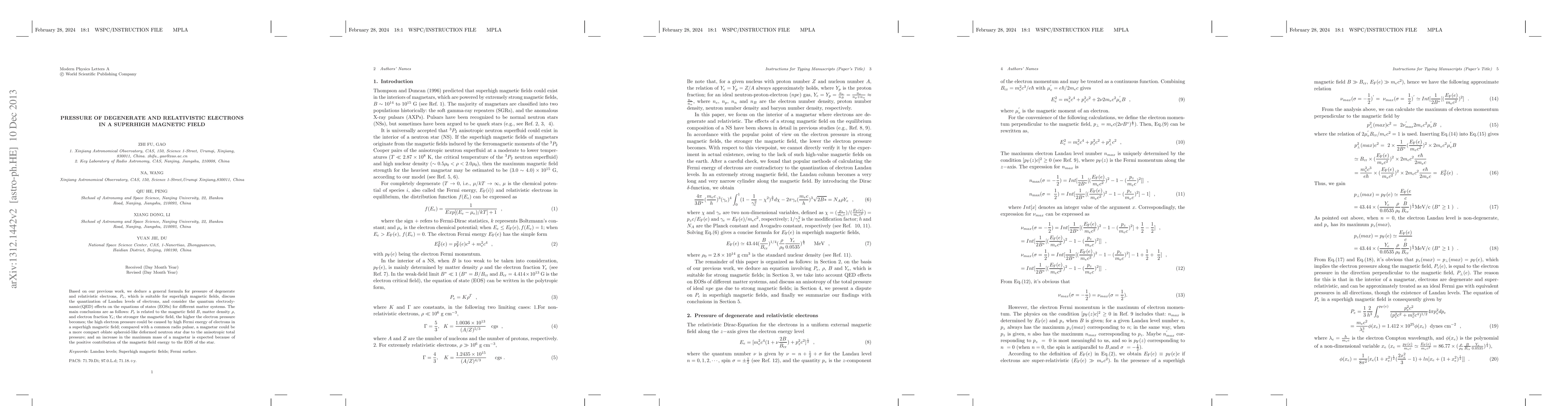 Based on our previous work, we deduce a general formula for pressure of degenerate and relativistic electrons,Pe, which is suitable for superhigh magnetic fields, discuss the quantization of Landau levels of electrons, and consider the quantum electrodynam-ic(QED) effects on the equations of states (EOSs) for different matter systems. The main conclusions are as follows:Pe is related to the magnetic field B, matter density ?, and electron fraction Ye ; the stronger the magnetic field, the higher the electron pressure becomes; the high electron pressure could be caused by high Fermi energy of electrons in a superhigh magnetic field; compared with a common radio pulsar, a magnetar could be a more compact oblate spheroid-like deformed neutron star due to the anisotropic total pressure; and an increase in the maximum mass of a magnetar is expected because of the positive contribution of the magnetic field energy to the EOS of the star.