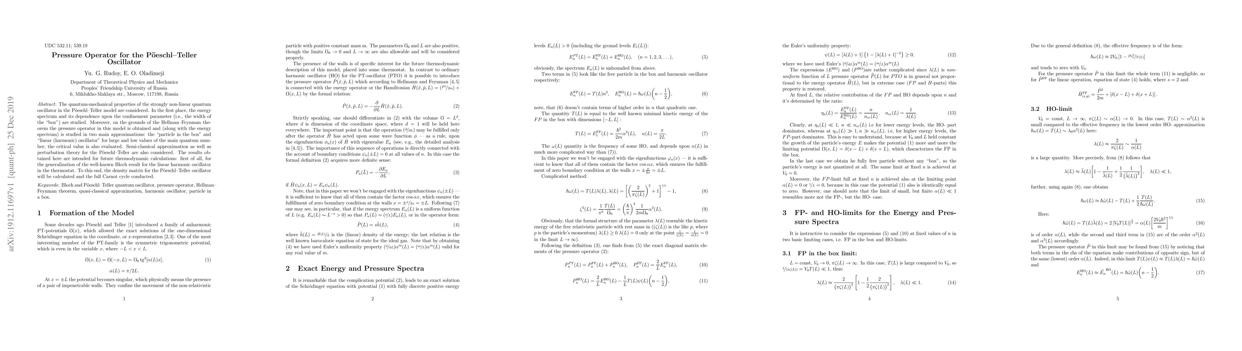 The quantum mechanical properties of the strongly non-linear quantum oscillator in the Poeschl Teller model are considered. In the first place, the energy spectrum and its dependence upon the confinement parameter i.e., the width of the box are studied. Moreover, on the grounds of the Hellman Feynman theorem the pressure operator in this model is obtained and along with the energy spectrum is studied in two main approximations: the particle in the box and linear harmonic oscillator for large and low values of the main quantum number; the critical value is also evaluated. Semi-classical approximation as well as perturbation theory for the Poeschl Teller are also considered. The results obtained here are intended for future thermodynamic calculations: first of all, for the generalization of the well known Bloch result for the linear harmonic oscillator in the thermostat. To this end, the density matrix for the Poeschl Teller oscillator will be calculated and the full Carnot cycle conducted.