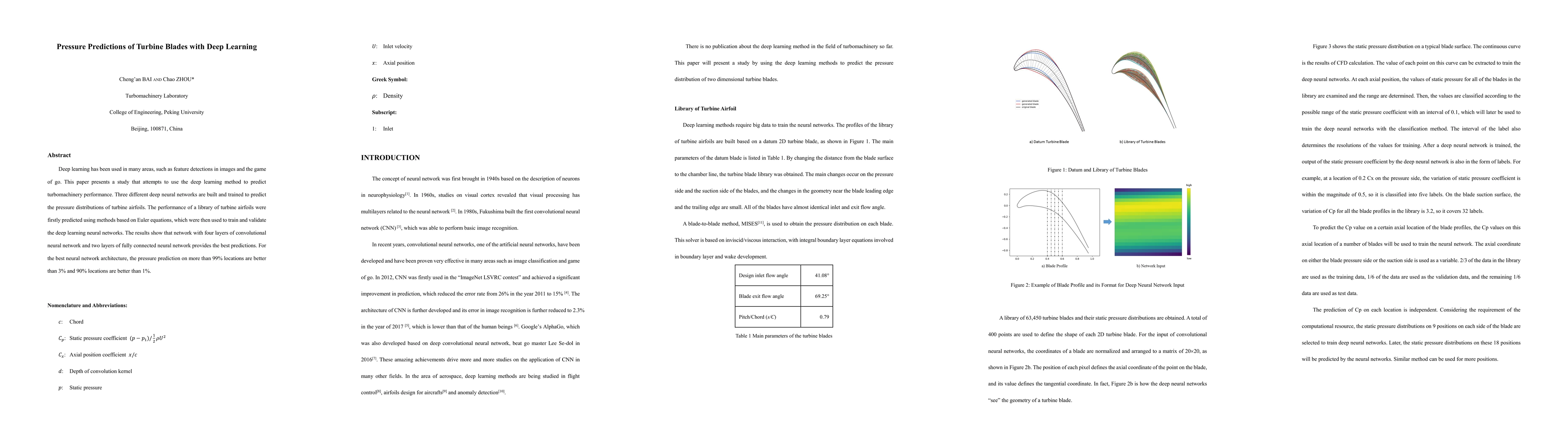 This paper explores the application of deep learning to predict pressure distributions on turbine blades, employing three different neural network architectures. The best-performing model, a combination of convolutional and fully connected layers, achieves pressure predictions with an error of less than 3% for over 99% of locations and less than 1% for 90% of locations.
