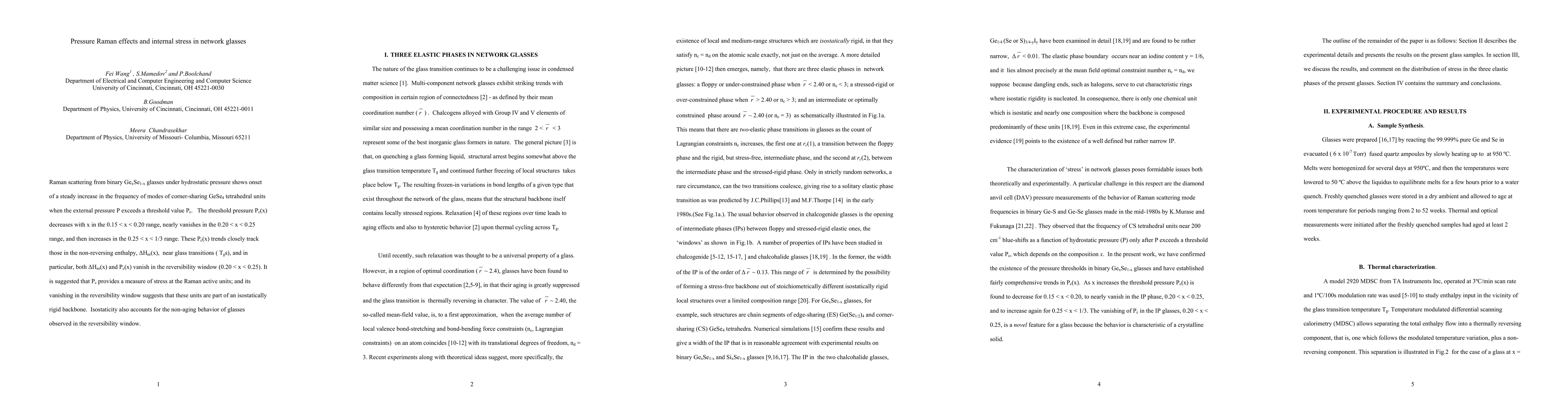 The research presents a detailed analysis of pressure-induced Raman shifts in GexSe1-x glasses, linking threshold pressures (Pc) to the structural changes and internal stress in network glasses.
