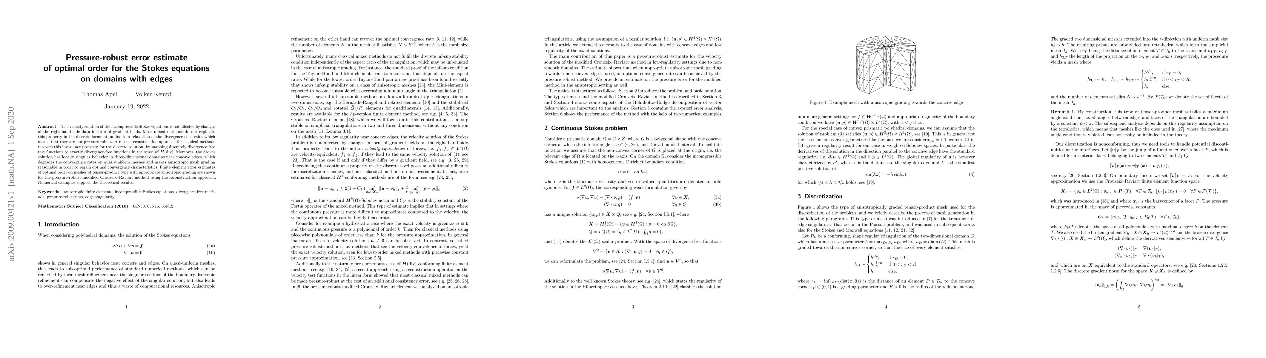 This paper presents a pressure-robust error estimate of optimal order for the Stokes equations on domains with edges, utilizing a reconstruction approach to maintain the divergence-free property in discrete solutions. It demonstrates optimal convergence using the modified Crouzeix-Raviart method on anisotropically graded meshes, supported by numerical examples.