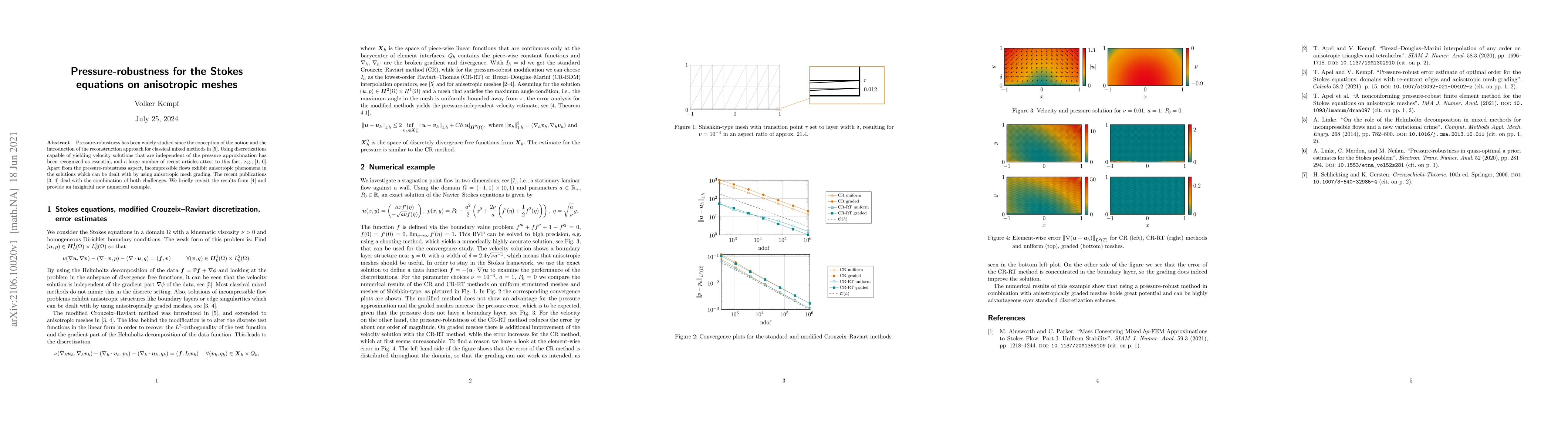 Pressure-robustness has been widely studied since the conception of the notion and the introduction of the reconstruction approach for classical mixed methods in [5]. Using discretizations capable of yielding velocity solutions that are independent of the pressure approximation has been recognized as essential, and a large number of recent articles attest to this fact, e.g., [1,6]. Apart from the pressure-robustness aspect, incompressible flows exhibit anisotropic phenomena in the solutions which can be dealt with by using anisotropic mesh grading. The recent publications [3,4] deal with the combination of both challenges. We briefly revisit the results from [4] and provide an insightful new numerical example.