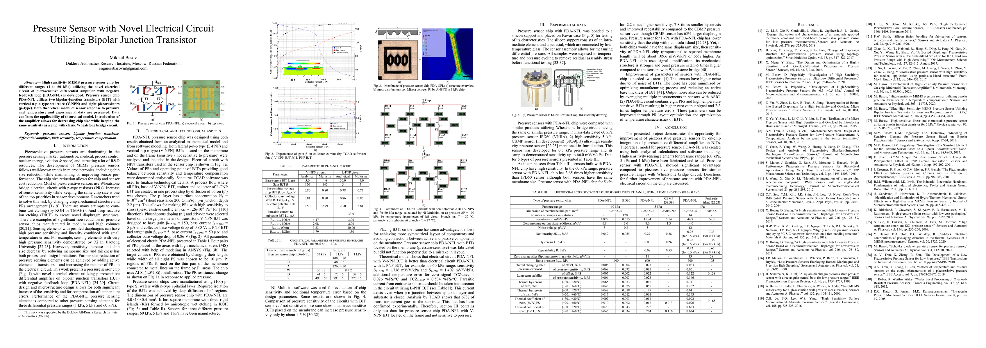 High sensitivity MEMS pressure sensor chip for different ranges (1 to 60 kPa) utilizing the novel electrical circuit of piezosensitive differential amplifier with negative feedback loop (PDA-NFL) is developed. Pressure sensor chip PDA-NFL utilizes two bipolar-junction transistors (BJT) with vertical n-p-n type structure (V-NPN) and eight piezoresistors (p-type). Both theoretical model of sensor response to pressure and temperature and experimental data are presented. Data confirms the applicability of theoretical model. Introduction of the amplifier allows for decreasing chip size while keeping the same sensitivity as a chip with classic Wheatstone bridge circuit.