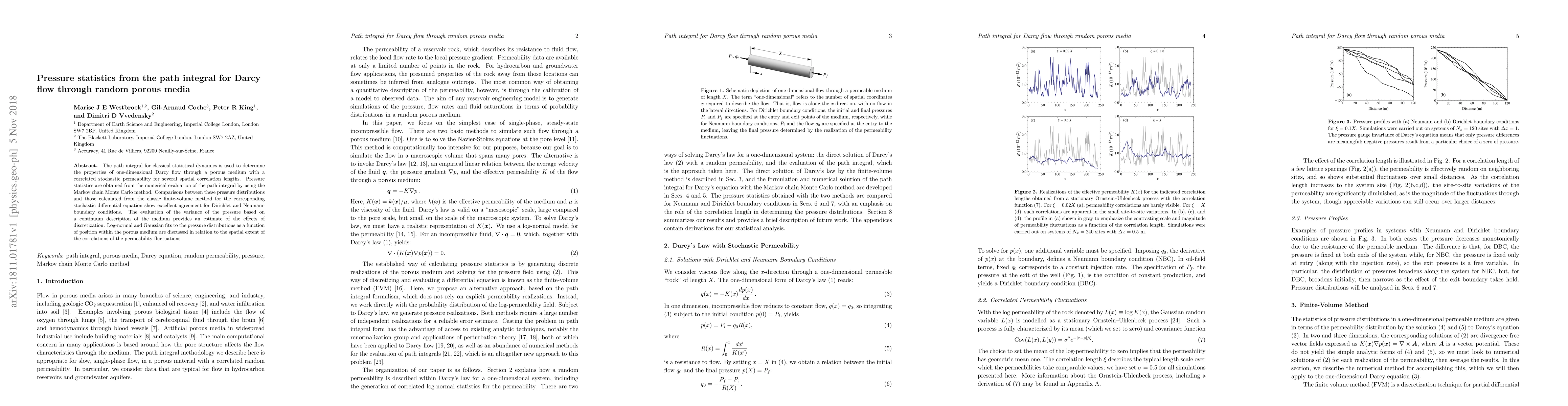 This paper uses a path integral approach combined with Markov chain Monte Carlo to analyze pressure statistics in Darcy flow through random porous media, comparing results to finite-volume methods and discussing the effects of permeability correlation lengths and discretization. Log-normal and Gaussian fits to pressure distributions reveal insights into permeability fluctuation correlations.