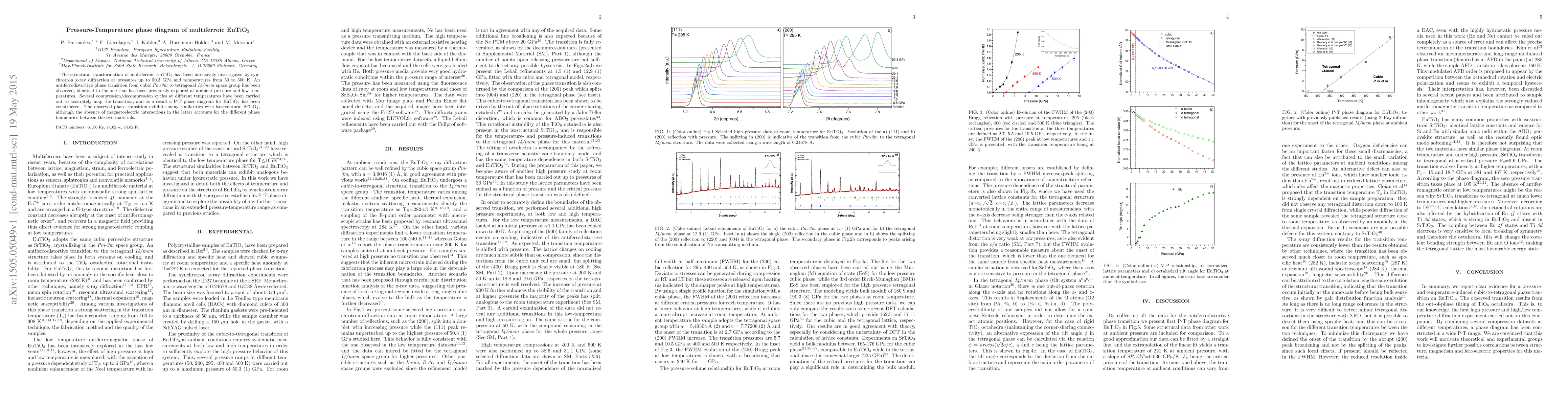 The structural transformation of multiferroic EuTiO$_3$ has been intensively investigated by synchrotron x-ray diffraction at pressures up to 50.3 GPa and temperatures from 50 to 500 K. An antiferrodistortive phase transition from cubic Pm-3m to tetragonal I4/mcm space group has been observed, identical to the one that has been previously explored at ambient pressure and low temperatures. Several compression/decompression cycles at different temperatures have been carried out to accurately map the transition, and as a result a P-T phase diagram for EuTiO$_3$ has been constructed. The observed phase transition exhibits many similarities with isostructural SrTiO$_3$, although the absence of magnetoelectric interactions in the latter accounts for the different phase boundaries between the two materials.
