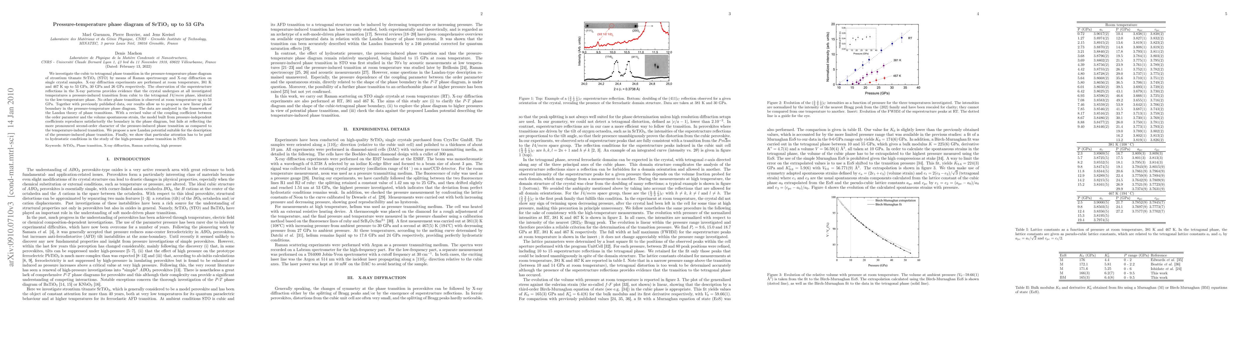 This study investigates the cubic to tetragonal phase transition in SrTiO3 using Raman spectroscopy and X-ray diffraction, revealing a pressure-induced transition to the tetragonal phase at all temperatures up to 53 GPa. A new linear phase boundary is proposed based on the data, and a revised Landau potential is suggested for better modeling the pressure-induced transition.
