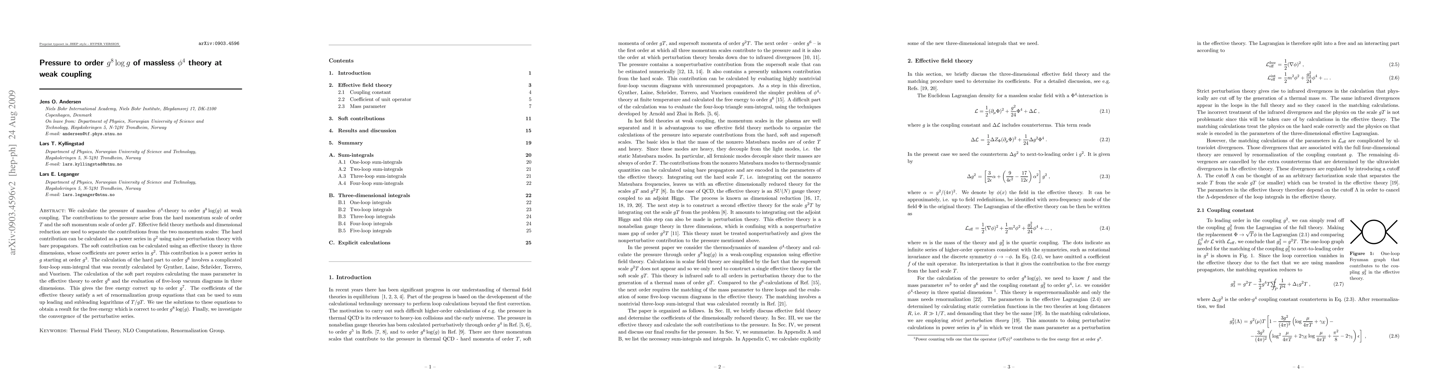 We calculate the pressure of massless $\phi^4$-theory to order $g^8\log(g)$ at weak coupling. The contributions to the pressure arise from the hard momentum scale of order $T$ and the soft momentum scale of order $gT$. Effective field theory methods and dimensional reduction are used to separate the contributions from the two momentum scales: The hard contribution can be calculated as a power series in $g^2$ using naive perturbation theory with bare propagators. The soft contribution can be calculated using an effective theory in three dimensions, whose coefficients are power series in $g^2$. This contribution is a power series in $g$ starting at order $g^3$. The calculation of the hard part to order $g^6$ involves a complicated four-loop sum-integral that was recently calculated by Gynther, Laine, Schr\"oder, Torrero, and Vuorinen. The calculation of the soft part requires calculating the mass parameter in the effective theory to order $g^6$ and the evaluation of five-loop vacuum diagrams in three dimensions. This gives the free energy correct up to order $g^7$. The coefficients of the effective theory satisfy a set of renormalization group equations that can be used to sum up leading and subleading logarithms of $T/gT$. We use the solutions to these equations to obtain a result for the free energy which is correct to order $g^8\log(g)$. Finally, we investigate the convergence of the perturbative series.