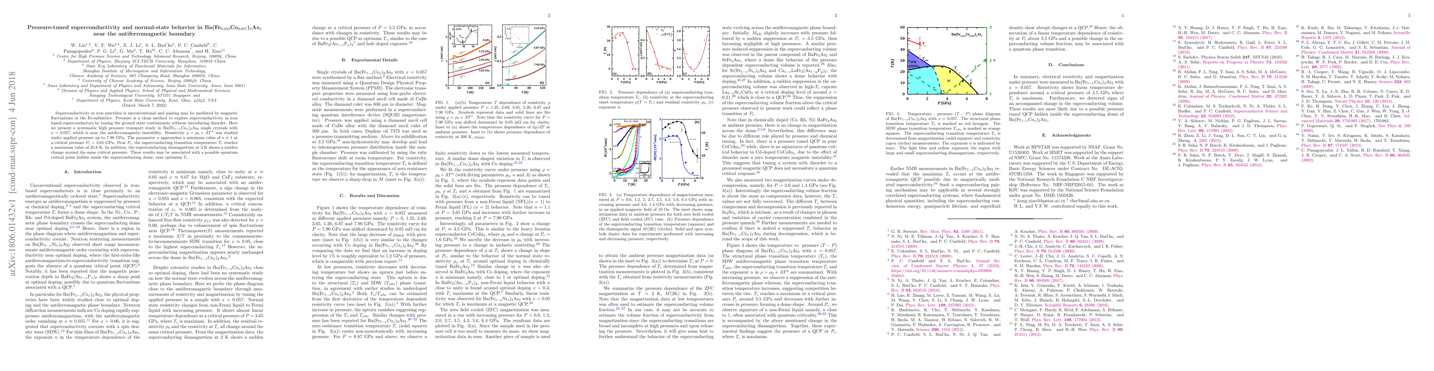 The research investigates superconductivity in Ba(Fe$_{0.943}$Co$_{0.057}$)$_2$As$_2$ near its antiferromagnetic boundary using high pressure. Key findings include a pressure-induced maximum in the superconducting transition temperature ($T_c$) at 25.8 K at a critical pressure of 3.65 GPa, and a sudden change in superconducting diamagnetism around the same pressure. This behavior suggests a possible quantum critical point near optimum $T_c$.