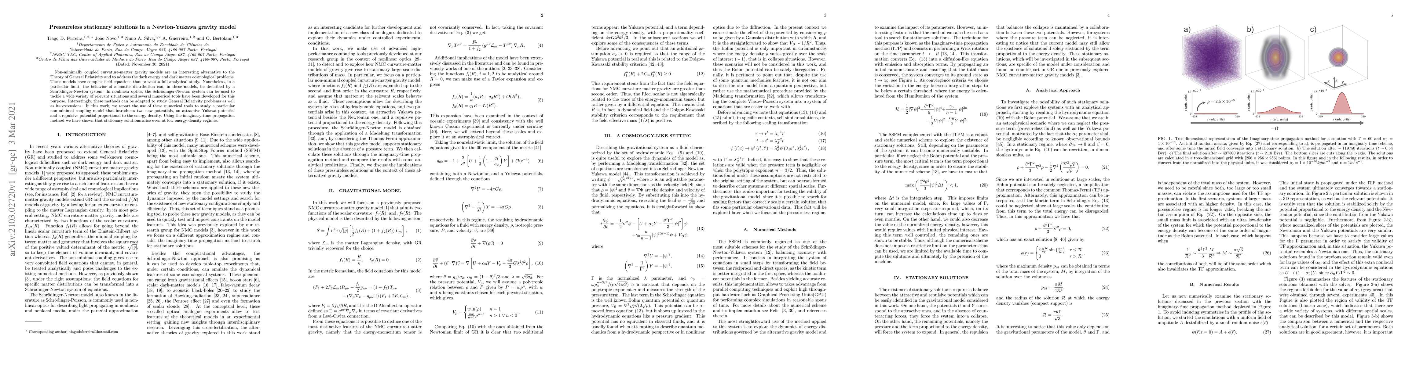 Non-minimally coupled curvature-matter gravity models are an interesting alternative to the Theory of General Relativity and to address the dark energy and dark matter cosmological problems. These models have complex field equations that prevent a full analytical study. Nonetheless, in a particular limit, the behavior of a matter distribution can, in these models, be described by a Schr\"odinger-Newton system. In nonlinear optics, the Schr\"odinger-Newton system can be used to tackle a wide variety of relevant situations and several numerical tools have been developed for this purpose. Interestingly, these methods can be adapted to study General Relativity problems as well as its extensions. In this work, we report the use of these numerical tools to study a particular non-minimal coupling model that introduces two new potentials, an attractive Yukawa potential and a repulsive potential proportional to the energy density. Using the imaginary-time propagation method we have shown that stationary solutions arise even at low energy density regimes.