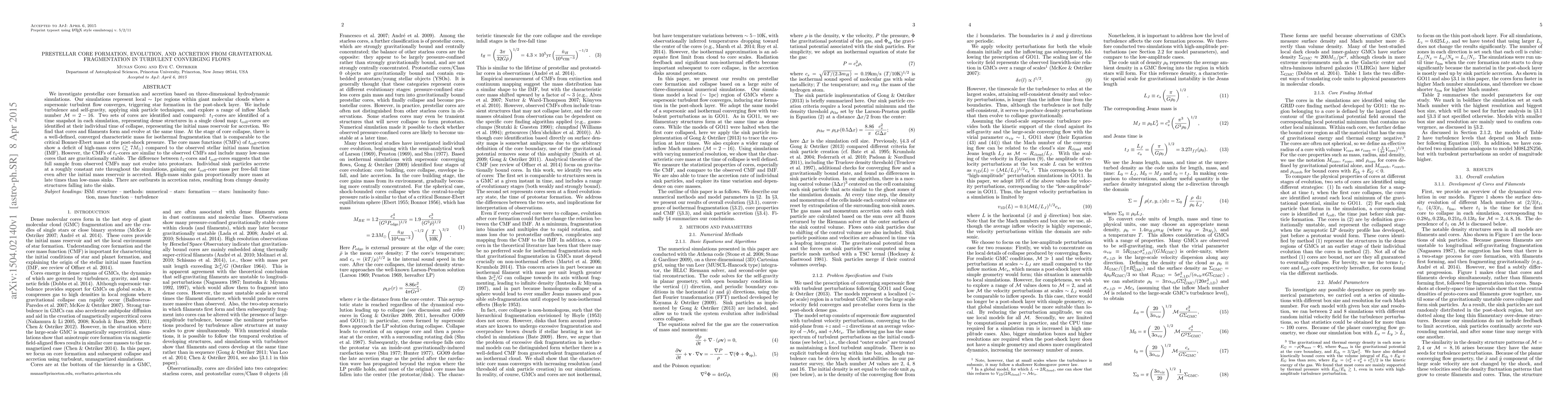 We investigate prestellar core formation and accretion based on three-dimensional hydrodynamic simulations. Our simulations represent local $\sim 1$pc regions within giant molecular clouds where a supersonic turbulent flow converges, triggering star formation in the post-shock layer. We include turbulence and self-gravity, applying sink particle techniques, and explore a range of inflow Mach number ${\cal M}=2-16$. Two sets of cores are identified and compared: $t_1$-cores are identified of a time snapshot in each simulation, representing dense structures in a single cloud map; $t_\mathrm{coll}$-cores are identified at their individual time of collapse, representing the initial mass reservoir for accretion. We find that cores and filaments form and evolve at the same time. At the stage of core collapse, there is a well-defined, converged characteristic mass for isothermal fragmentation that is comparable to the critical Bonner-Ebert mass at the post-shock pressure. The core mass functions (CMFs) of $t_\mathrm{coll}$-cores show a deficit of high-mass cores ($\gtrsim 7M_\odot$) compared to the observed stellar initial mass function (IMF). However, the CMFs of $t_1$-cores are similar to the observed CMFs and include many low-mass cores that are gravitationally stable. The difference between $t_1$-cores and $t_\mathrm{coll}$-cores suggests that the full sample from observed CMFs may not evolve into protostars. Individual sink particles accrete at a roughly constant rate throughout the simulations, gaining one $t_\mathrm{coll}$-core mass per free-fall time even after the initial mass reservoir is accreted. High-mass sinks gain proportionally more mass at late times than low-mass sinks. There are outbursts in accretion rates, resulting from clumpy density structures falling into the sinks.