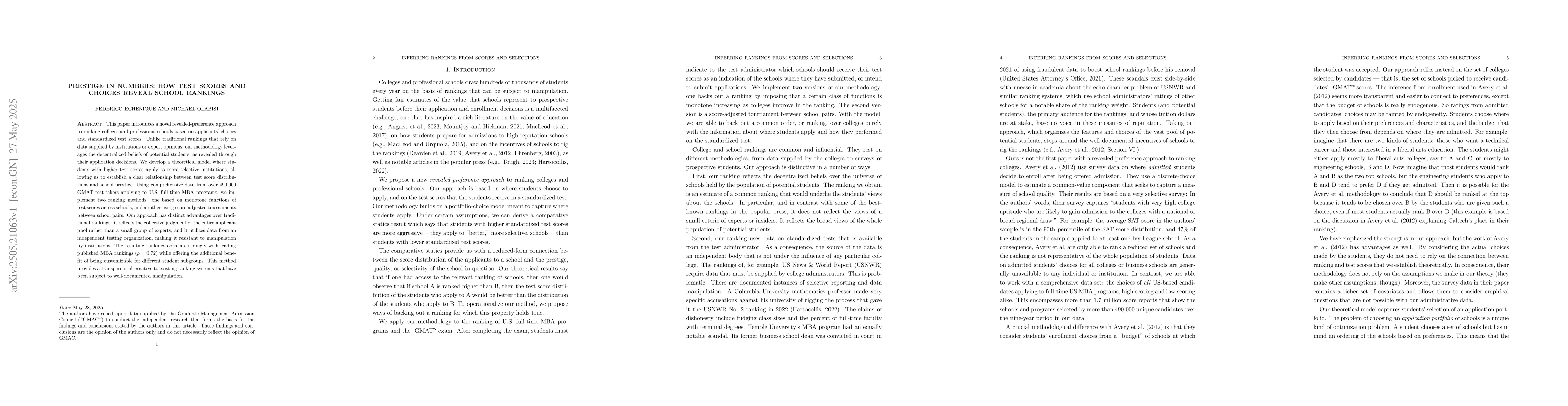 This paper introduces a novel revealed-preference approach to ranking colleges and professional schools based on applicants' choices and standardized test scores. Unlike traditional rankings that rely on data supplied by institutions or expert opinions, our methodology leverages the decentralized beliefs of potential students, as revealed through their application decisions. We develop a theoretical model where students with higher test scores apply to more selective institutions, allowing us to establish a clear relationship between test score distributions and school prestige. Using comprehensive data from over 490,000 GMAT test-takers applying to U.S. full-time MBA programs, we implement two ranking methods: one based on monotone functions of test scores across schools, and another using score-adjusted tournaments between school pairs. Our approach has distinct advantages over traditional rankings: it reflects the collective judgment of the entire applicant pool rather than a small group of experts, and it utilizes data from an independent testing organization, making it resistant to manipulation by institutions. The resulting rankings correlate strongly with leading published MBA rankings ($\rho = 0.72$) while offering the additional benefit of being customizable for different student subgroups. This method provides a transparent alternative to existing ranking systems that have been subject to well-documented manipulation.