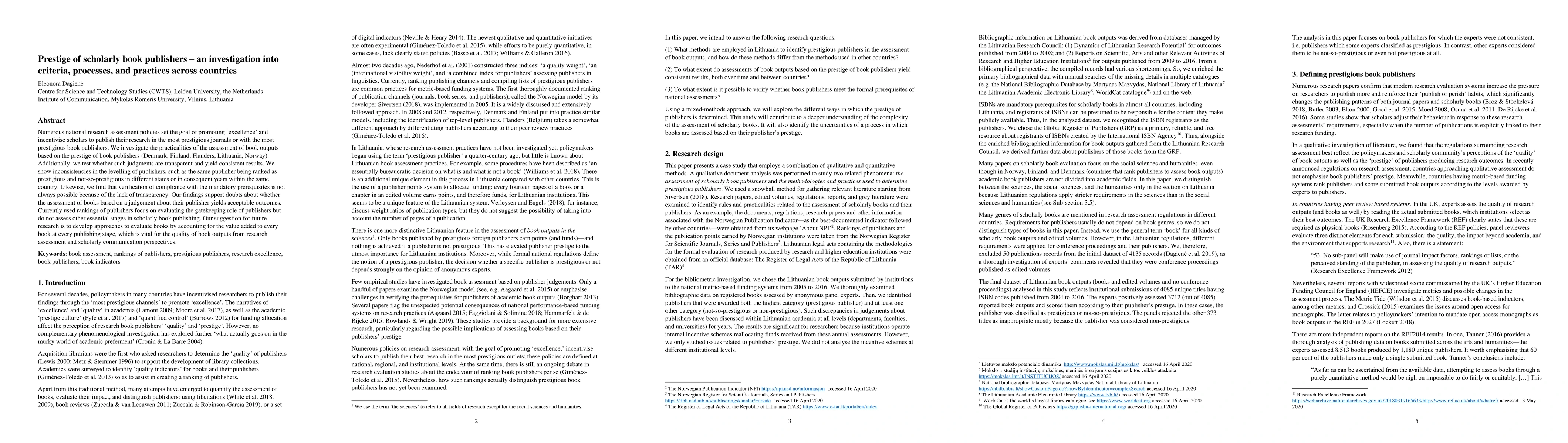 This paper investigates the criteria and processes used to assess scholarly book publishers' prestige across several countries, revealing inconsistencies and lack of transparency in ranking practices. The study suggests that current methods do not adequately evaluate the full value of scholarly books, advocating for future research to assess books based on the value added at each publishing stage.