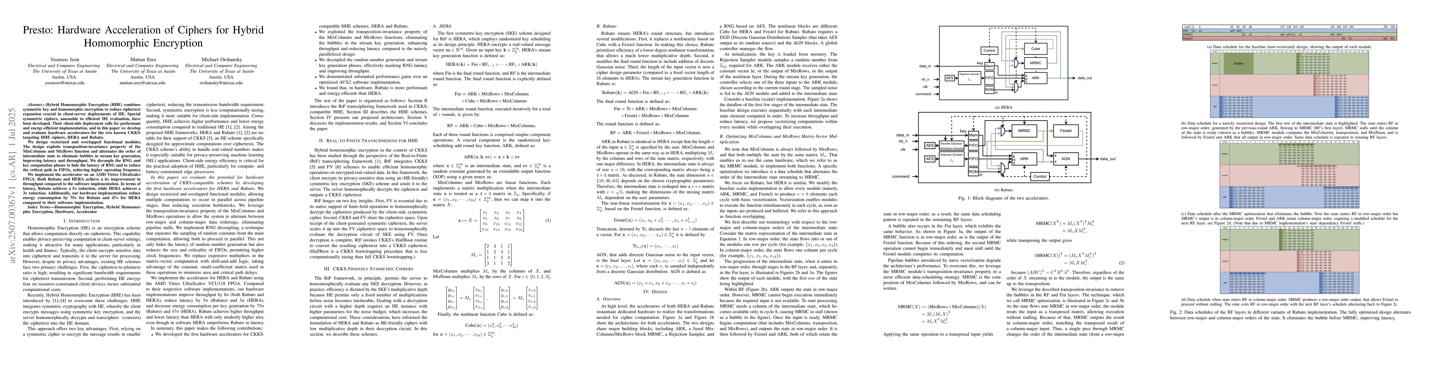 Hybrid Homomorphic Encryption (HHE) combines symmetric key and homomorphic encryption to reduce ciphertext expansion crucial in client-server deployments of HE. Special symmetric ciphers, amenable to efficient HE evaluation, have been developed. Their client-side deployment calls for performant and energy-efficient implementation, and in this paper we develop and evaluate hardware accelerators for the two known CKKS-targeting HHE ciphers, HERA and Rubato. We design vectorized and overlapped functional modules. The design exploits transposition-invariance property of the MixColumns and MixRows function and alternates the order of intermediate state to eliminate bubbles in stream key generation, improving latency and throughput. We decouple the RNG and key computation phases to hide the latency of RNG and to reduce the critical path in FIFOs, achieving higher operating frequency. We implement the accelerator on an AMD Virtex UltraScale+ FPGA. Both Rubato and HERA achieve a 6x improvement in throughput compared to the software implementation. In terms of latency, Rubato achieves a 5x reduction, while HERA achieves a 3x reduction. Additionally, our hardware implementations reduce energy consumption by 75x for Rubato and 47x for HERA compared to their software implementation.