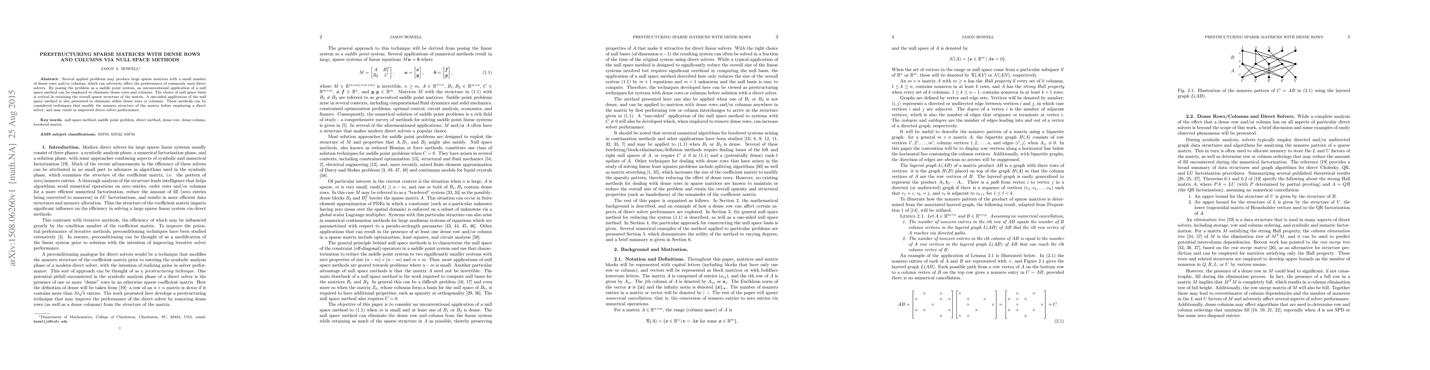 This paper explores methods to prestructure large sparse matrices with dense rows/columns by using null space techniques to eliminate dense elements, thereby improving the performance of direct solvers. The choice of null space basis is crucial for maintaining the matrix's sparse structure, and one-sided null space applications are also discussed.