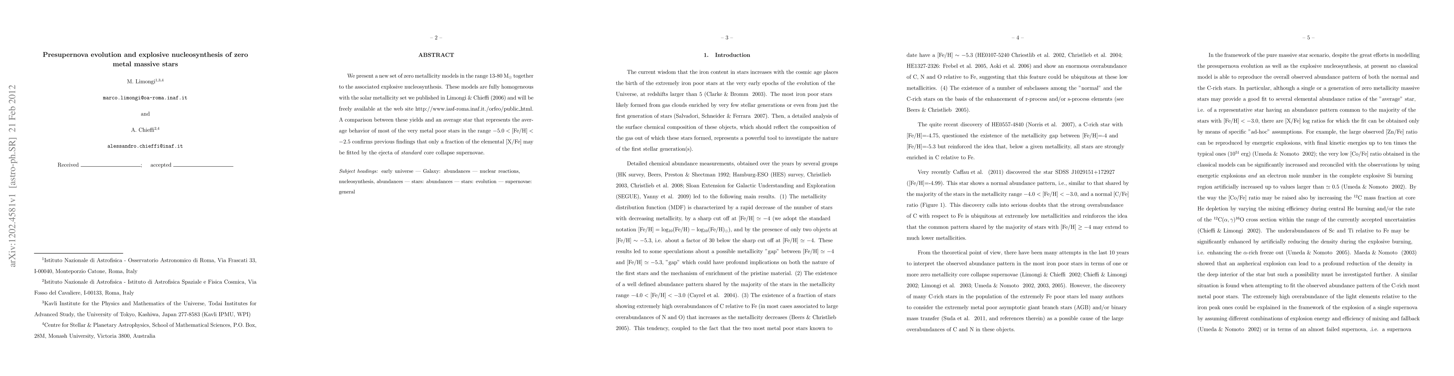 This paper introduces new zero metallicity models for massive stars ranging from 13 to 80 solar masses, detailing their presupernova evolution and explosive nucleosynthesis. The findings suggest that only a portion of elemental abundances in very metal-poor stars can be explained by standard core collapse supernovae.