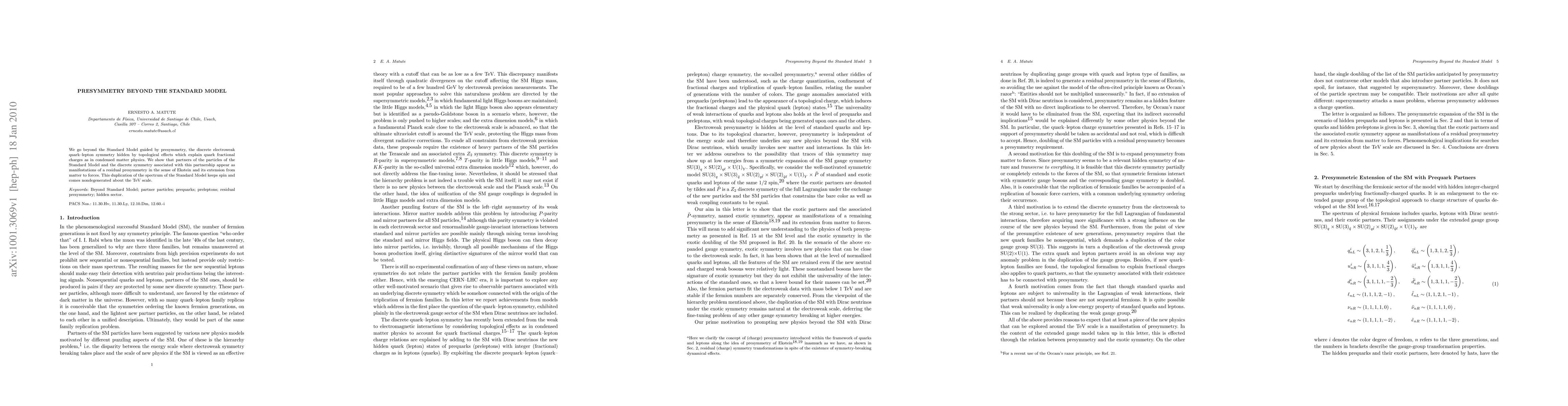 This paper explores the concept of presymmetry beyond the Standard Model, proposing a discrete electroweak quark-lepton symmetry hidden by topological effects. It suggests that presymmetry manifests in the form of particle partners and residual symmetry at the TeV scale, maintaining spin without degeneracies.