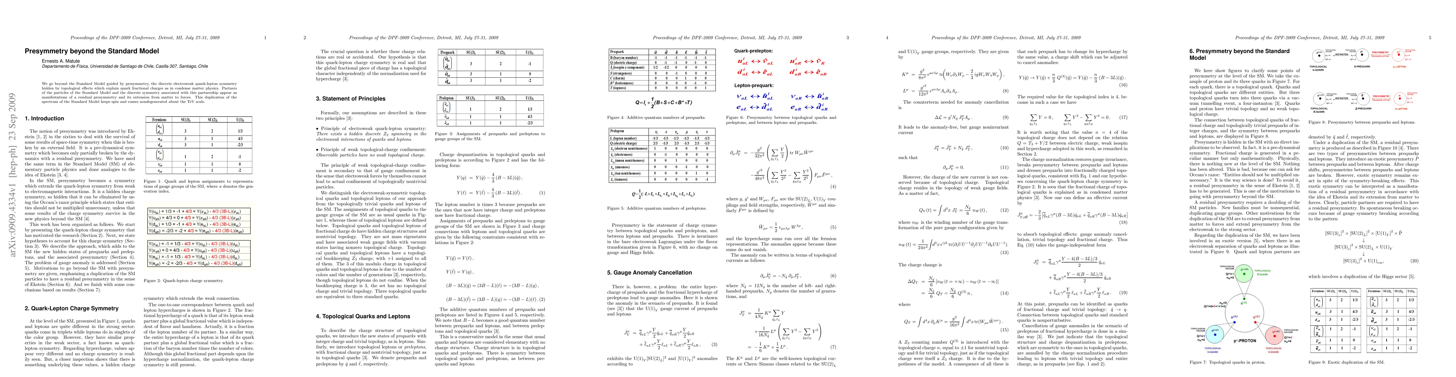 This paper explores a new framework beyond the Standard Model called presymmetry, which posits a hidden electroweak quark-lepton symmetry. It proposes that this symmetry, revealed through topological effects, explains fractional quark charges and introduces particle partners that manifest a residual presymmetry extending from matter to forces.